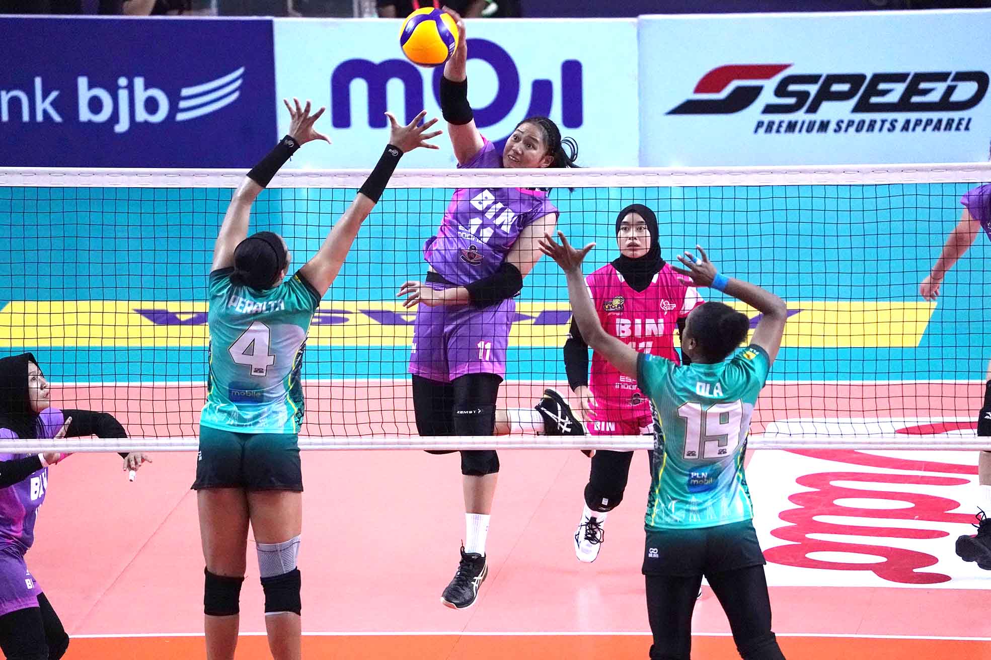 Tim bola voli putri Jakarta BIN berhasil menorehkan debut manis di arena Proliga 2023. Mereka mengalahkan Jakarta Elektrik PLN dengan skor 3-1 (25-23, 25-21, 20-25, 31-28) di GOR Si Jalak Harupat, Bandung, 7 Januari. (Photo : Erly Bahtiar/sportsmoment.id)