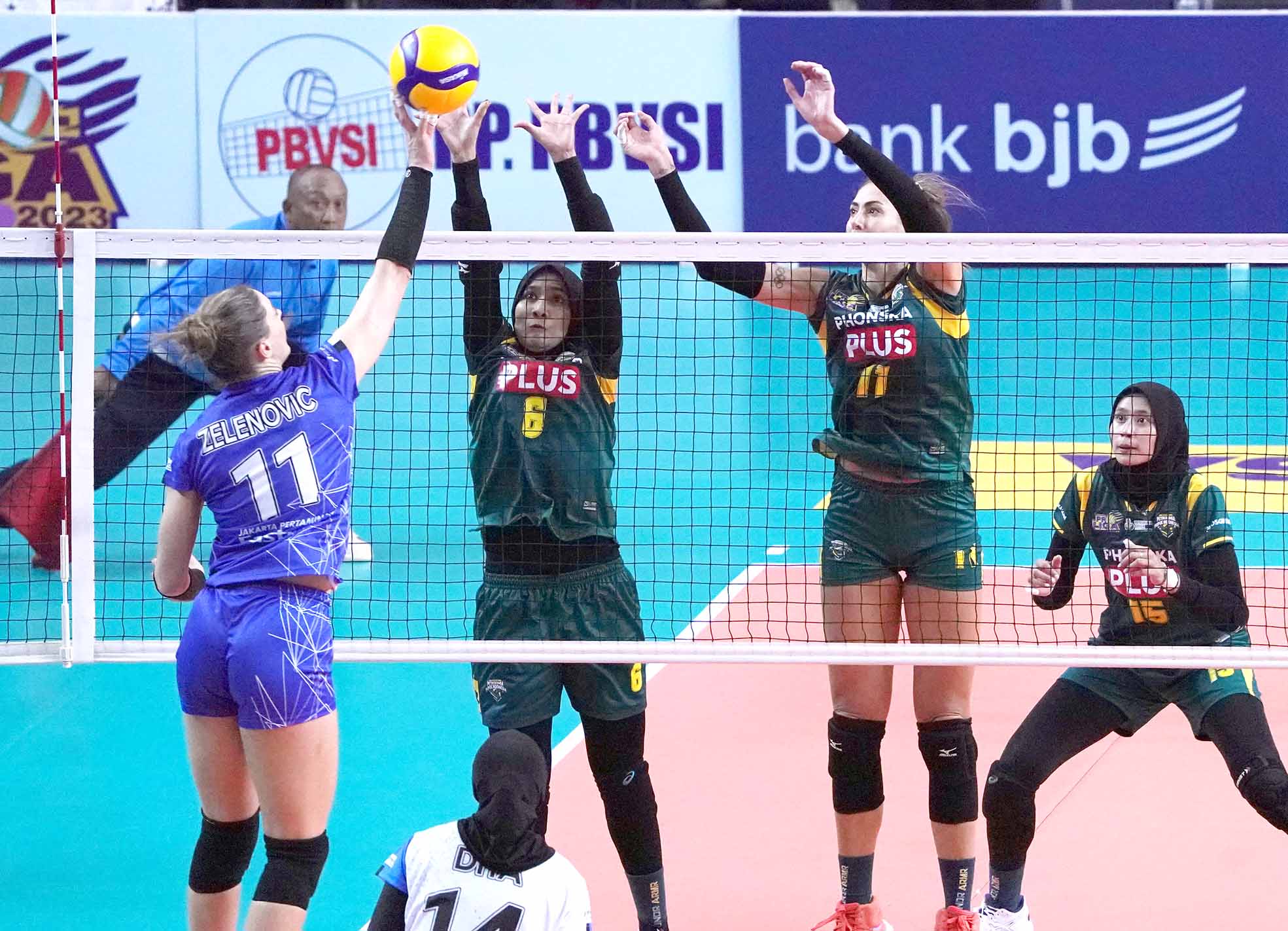 6 YOLANA BHETA PANGESTIKA dan 11 JULIETA CONSTANZA LAZCANO COLODRERO, menghadang bola 11 MARIJA ZELENOVIC