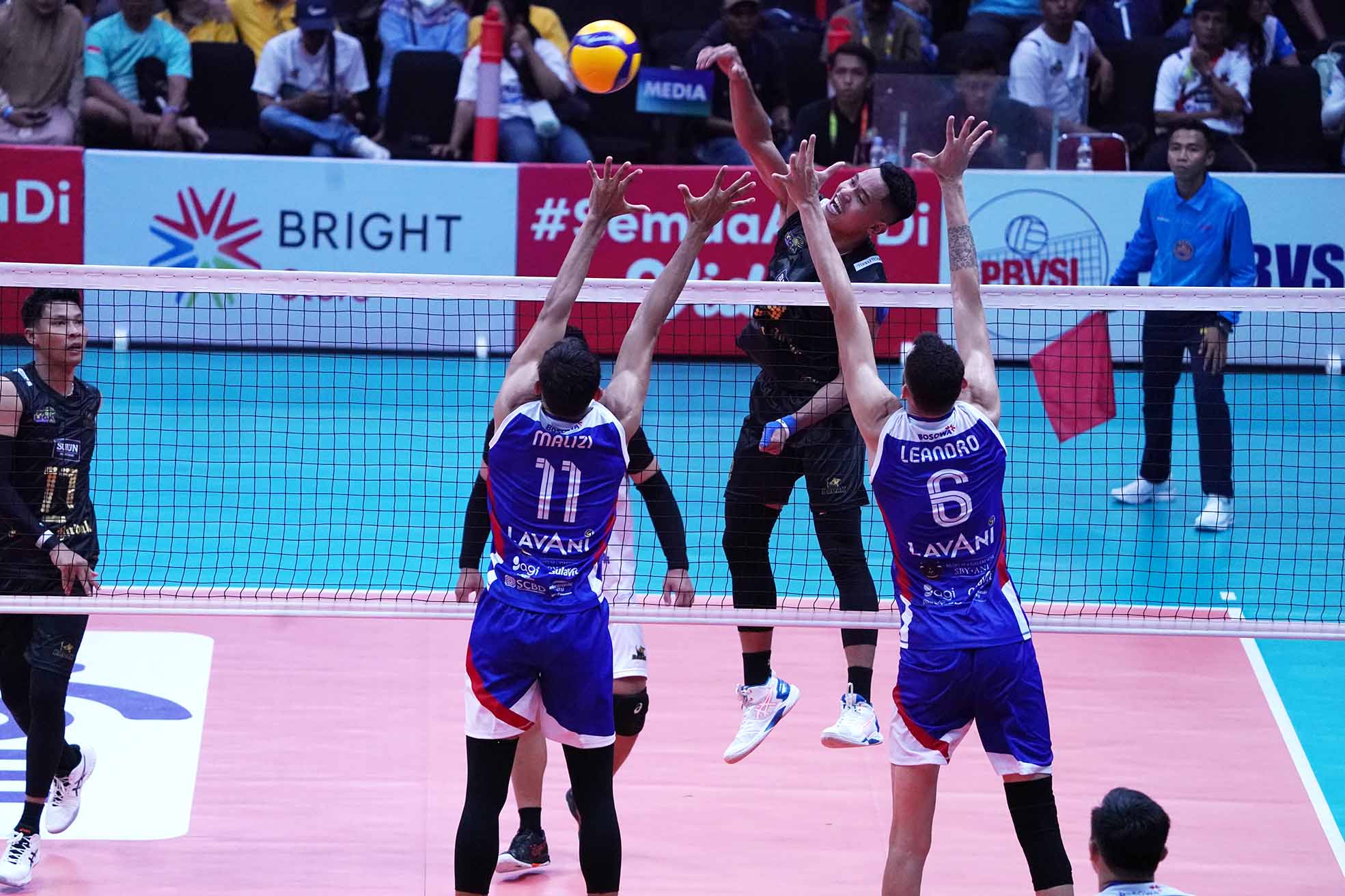 Jakarta LavAni Allo Bank (Biru) mengalahkan Kudus Sukun Badak (Merah) dengan skor 3-0 (25-21, 25-15, 25-20)