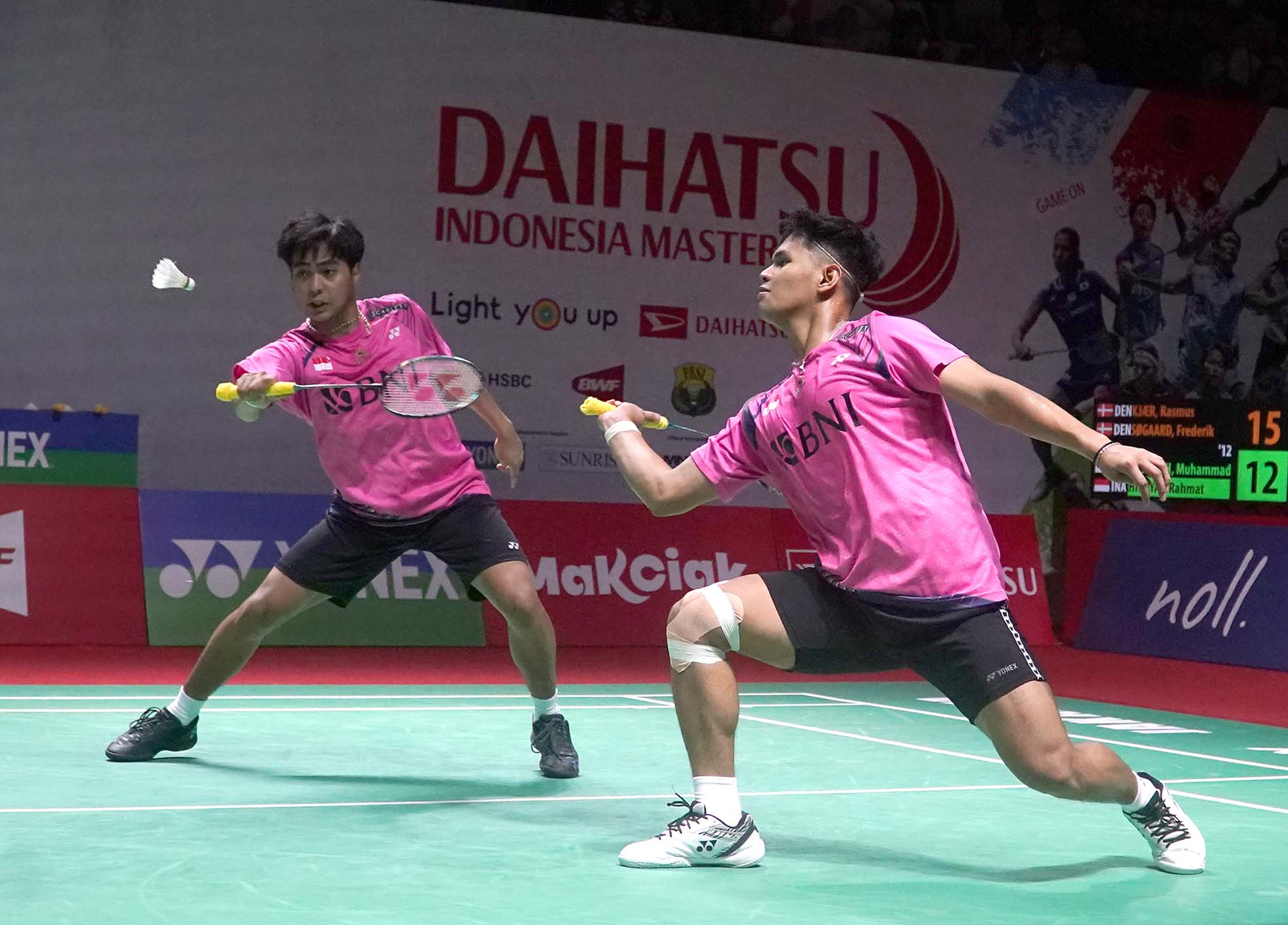 Ganda putra Indonesia, Muhammad Rayhan Nur Fadillah/Rahmat Hidayat dikalahkan ganda putra Denmark, Rasmus KJÆR/ Frederik SØGAARD dua gim langsung, 14-21 dan 13-21 pada babak kualifikasi gelaran Daihatsu Indonesia Masters 2023, Selasa (24/1), di Istora Senayan Jakarta. (Foto : HO/Humas PP PBSI/Erly Bahtiar/Sportsmoment)