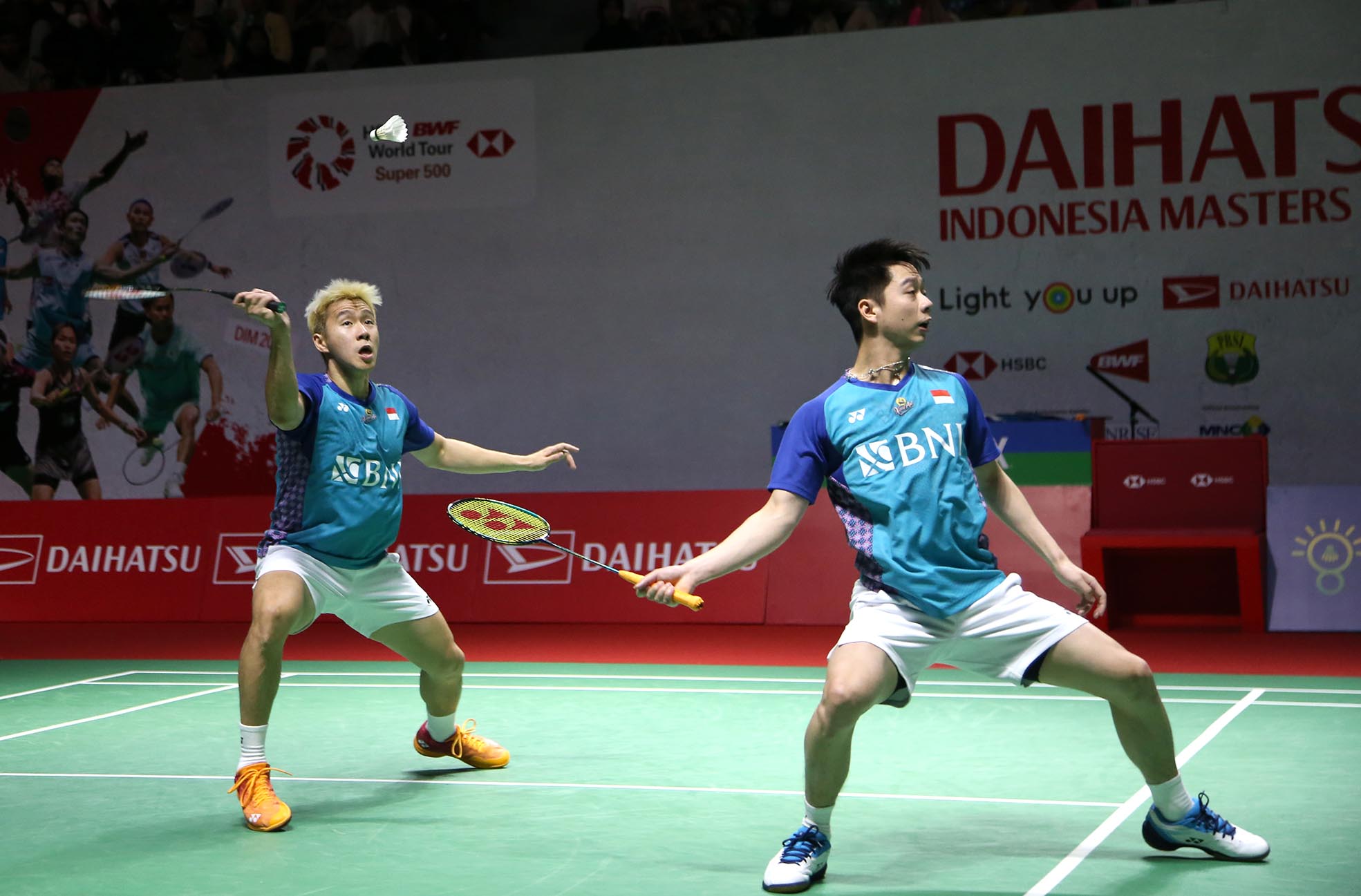 Ganda putra Indonesia, Marcus Fernaldi Gideon/Kevin Sanjaya Sukamuljo berhasil mengalahkan ganda putra Korea Selatan, Kang Min Hyuk/Seo Seung Jae dua gim langsung, 21-17 dan 21-12 pada babak pertama gelaran Daihatsu Indonesia Masters 2023, Selasa (24/1), di Istora Senayan Jakarta. (Foto : HO/Humas PP PBSI/Erly Bahtiar/Sportsmoment)