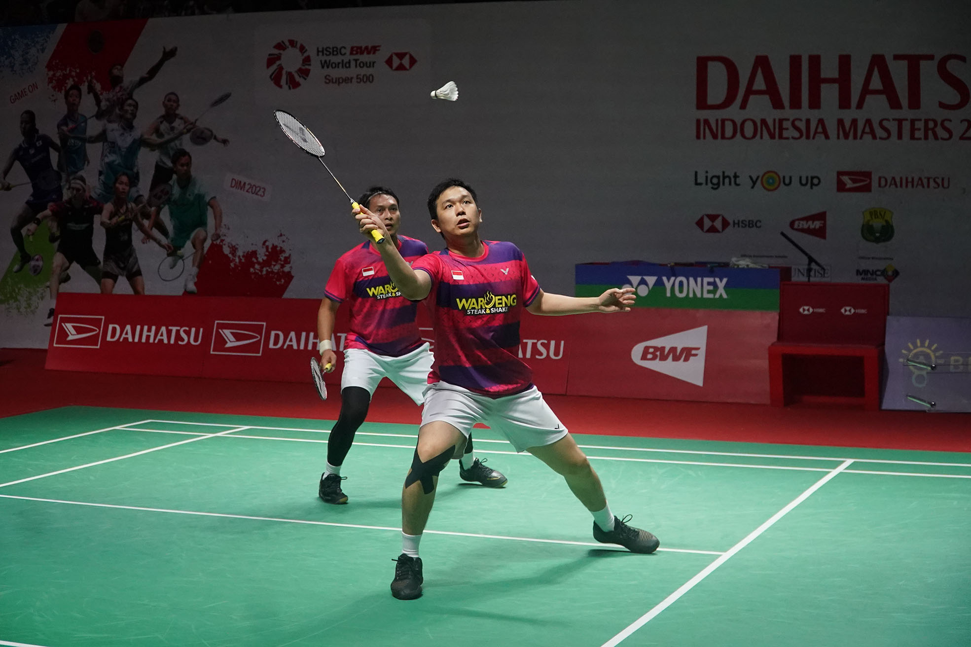 Ganda putra Indonesia, Mohammad Ahsan/Hendra Setiawan berhasil mengalahkan ganda putra Jepang, Akira Koga/Taichi Saito melalui pertarungan tiga gim, 17-21, 21-19 dan 21-10 pada babak pertama gelaran Daihatsu Indonesia Masters 2023, Selasa (24/1), di Istora Senayan Jakarta. (Foto : HO/Humas PP PBSI/Erly Bahtiar/Sportsmoment)