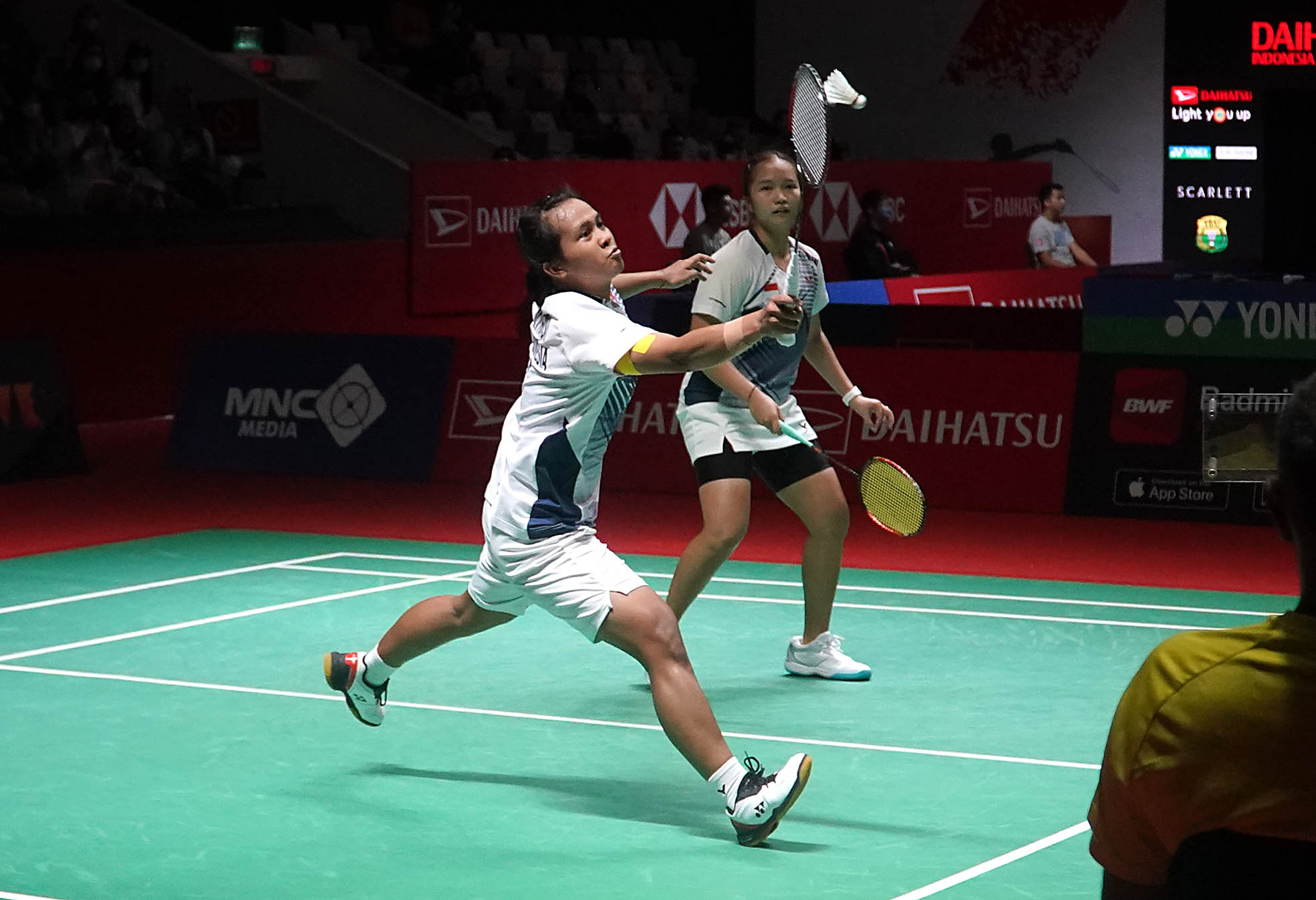 Ganda putri Indonesia, Meilysa Trias Puspita Sari/Rachel Allessya Rose dikalahkan ganda putri Amerika, Francesca Corbett/Allison Lee melalui pertarungan tiga gim, 21-8, 19-21 dan 18-21 pada babak pertama gelaran Daihatsu Indonesia Masters 2023, Rabu (25/1), di Istora Senayan Jakarta. (Foto : HO/Humas PP PBSI/Erly Bahtiar/Sportsmoment)
