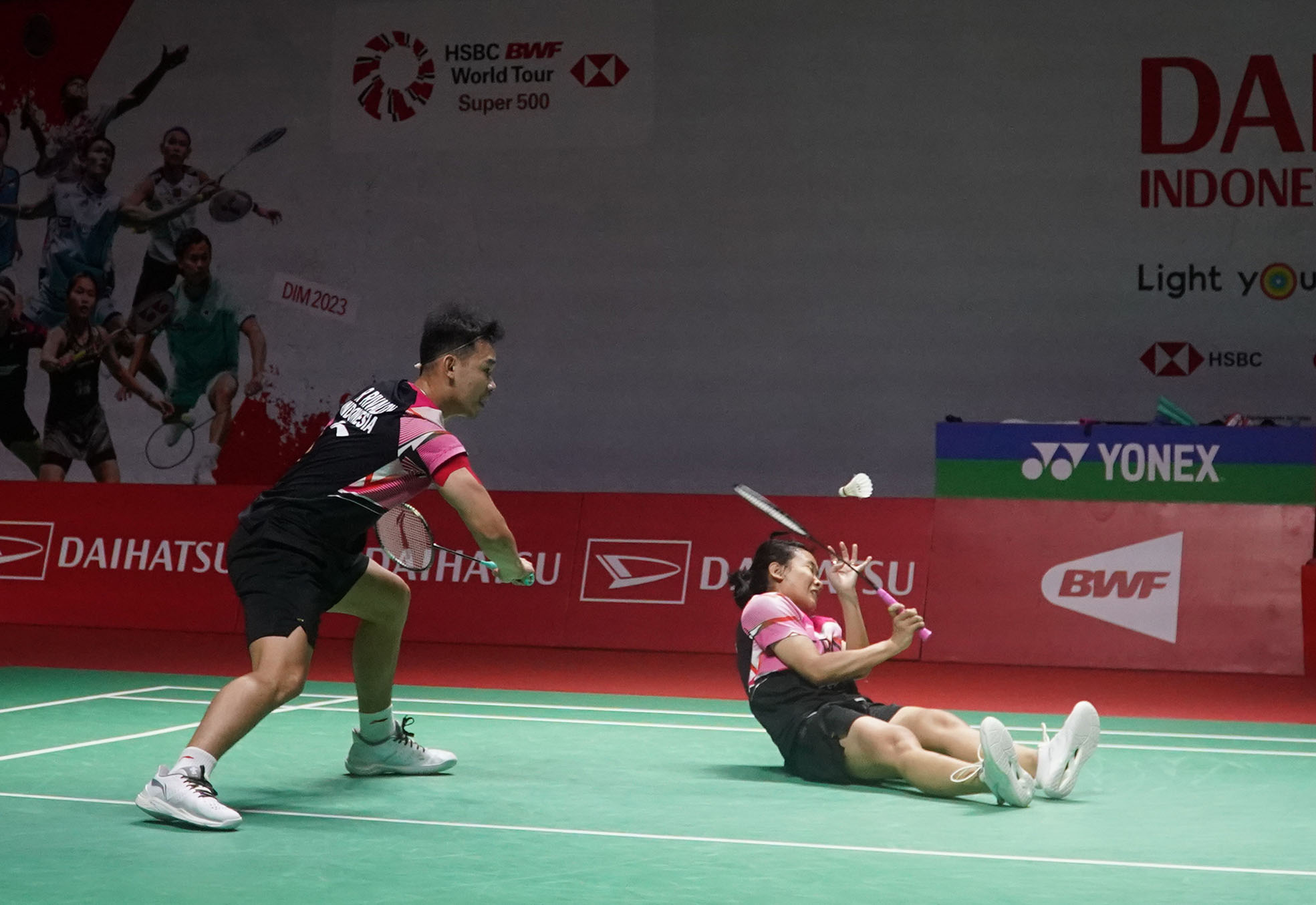 Ganda campuran Indonesia, Rinov Rivaldy/Pitha Haningtyas Mentari berhasil mengalahkan ganda campuran Jepang, Hiroki Midorikawa/Natsu Saito dua gim langsung, 21-19 dan 21-14 pada babak pertama gelaran Daihatsu Indonesia Masters 2023, Rabu (25/1), di Istora Senayan Jakarta. (Foto : HO/Humas PP PBSI/Erly Bahtiar/Sportsmoment)