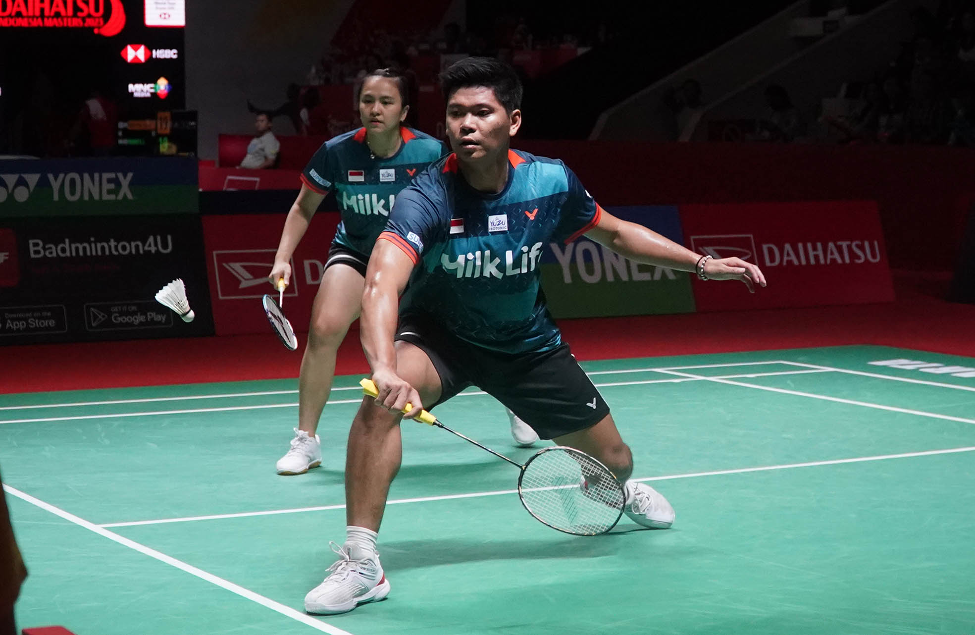 Ganda campuran Indonesia, Praveen Jordan/Melati Daeva Oktavianti dikalahkan ganda campuran Tiongkok, Feng Yan Zhe/Huang Dong Ping dua gim langsung, 17-21 dan 13-21pada babak pertama gelaran Daihatsu Indonesia Masters 2023, Rabu (25/1), di Istora Senayan Jakarta. (Foto : HO/Humas PP PBSI/Erly Bahtiar/Sportsmoment)