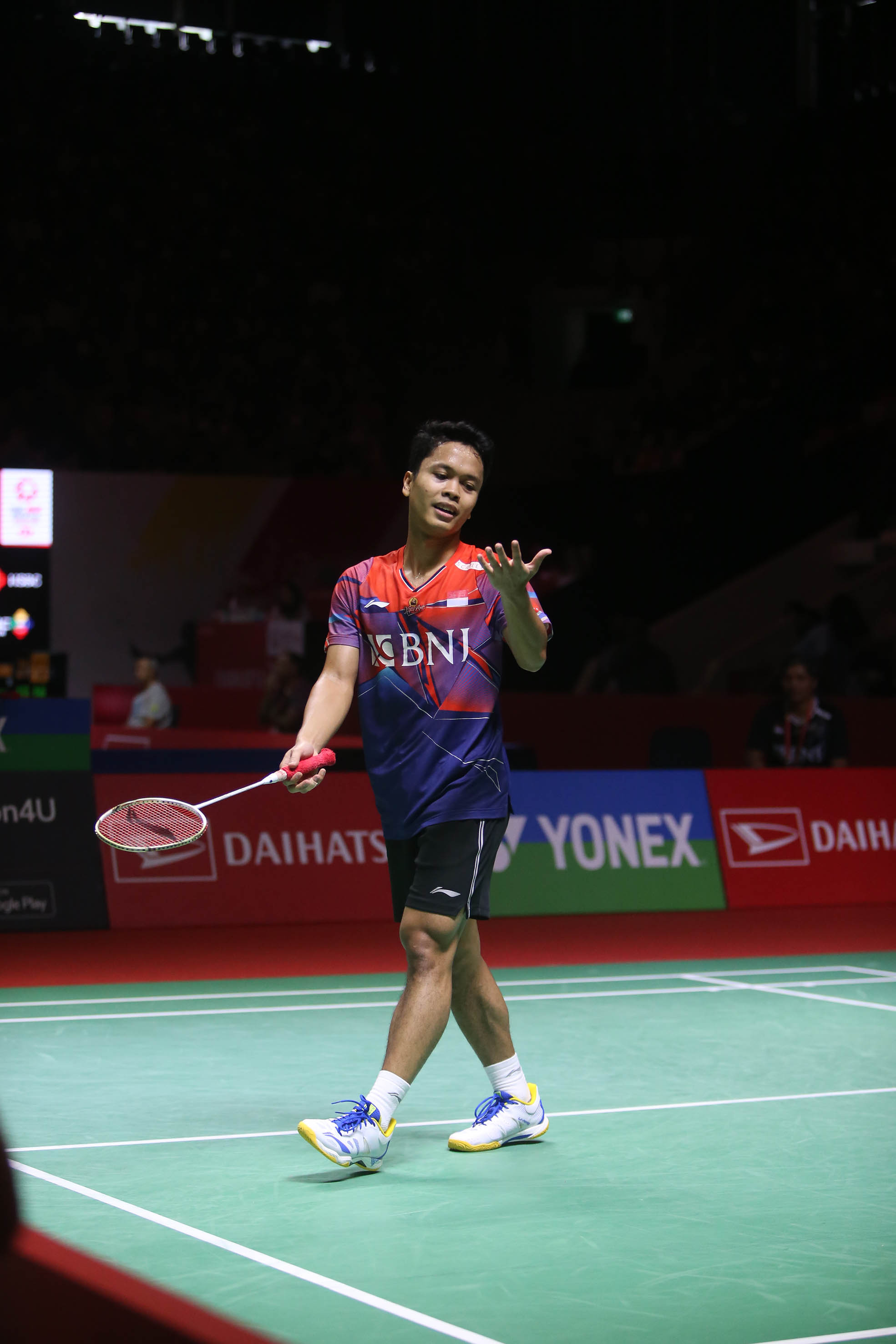 Tunggal putra Indonesia, Anthony Sinisuka Ginting dikalahkan tunggal putra Tiongkok, Shi Yu Qi dua gim langsung, 19-21 dan 16-21 pada babak kedua gelaran Daihatsu Indonesia Masters 2023, Kamis (26/1), di Istora Senayan Jakarta. (Foto : HO/Humas PP PBSI/Erly Bahtiar/Sportsmoment),