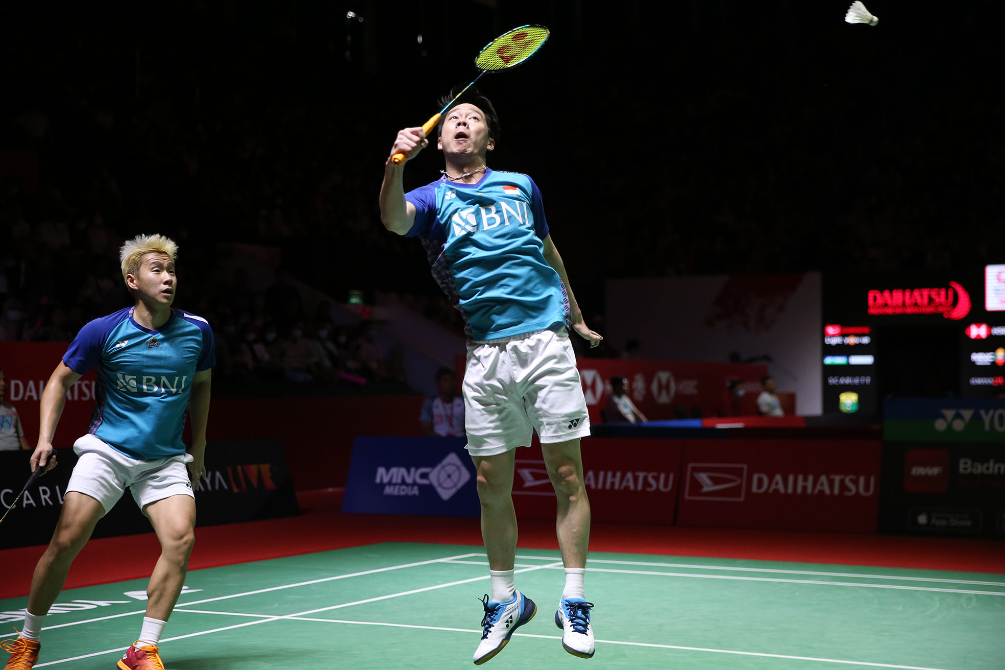 Ganda putra Indonesia, Marcus Fernaldi Gideon/Kevin Sanjaya Sukamuljo dikalahkan ganda putra Tiongkok, Liu Yu Chen/Ou Xuan Yi melalui pertarungan tiga gim, 21-19, 8-21 dan 11-6 retired pada babak kedua gelaran Daihatsu Indonesia Masters 2023, Kamis (26/1), di Istora Senayan Jakarta. (Foto : HO/Humas PP PBSI/Erly Bahtiar/Sportsmoment)