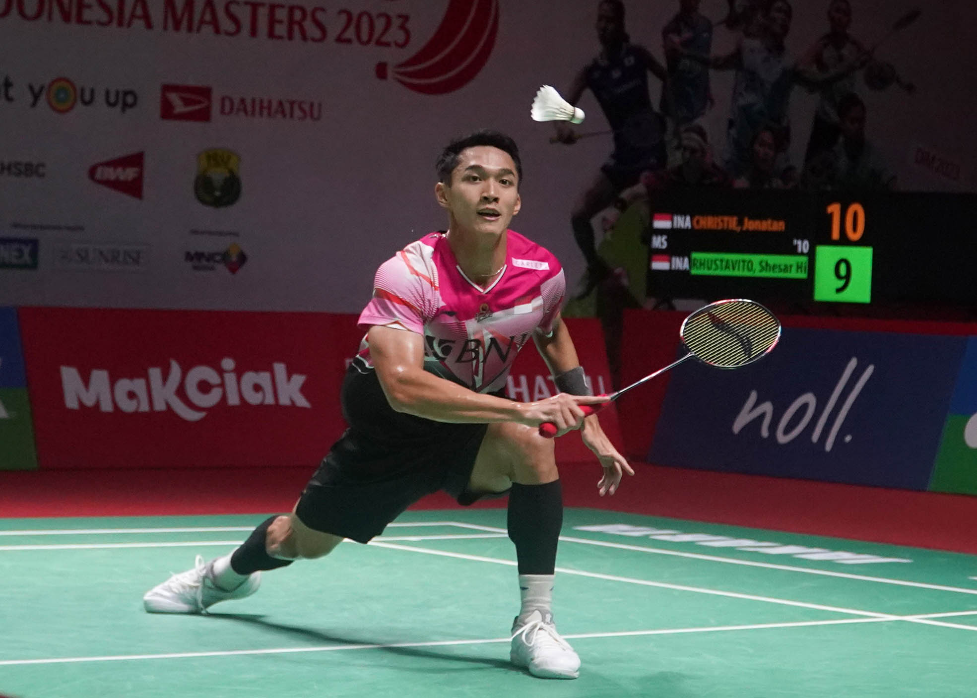 Tunggal putra Indonesia, Jonatan Christie berhasil mengalahkan kompatriotnya, Shesar Hiren Rhustavito dua gim langsung, 21-16 dan 21-15 pada babak kedua gelaran Daihatsu Indonesia Masters 2023, Kamis (26/1), di Istora Senayan Jakarta. (Foto : HO/Humas PP PBSI/Erly Bahtiar/Sportsmoment)