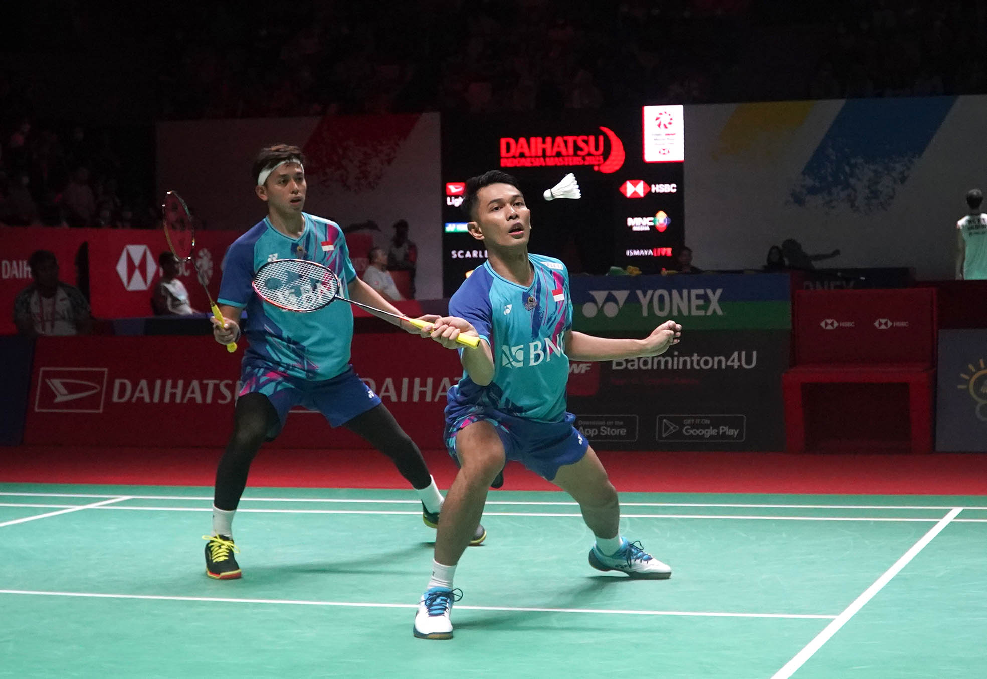 Ganda putra Indonesia, Fajar Alfian/Muhammad Rian Ardianto berhasil mengalahkan ganda putra Chinese Taipei, Chang Ko-Chi/Po Li-Wei melalui pertarungan tiga gim, 13-21, 21-9 dan 21-14 pada babak kedua gelaran Daihatsu Indonesia Masters 2023, Kamis (26/1), di Istora Senayan Jakarta. (Foto : HO/Humas PP PBSI/Erly Bahtiar/Sportsmoment)