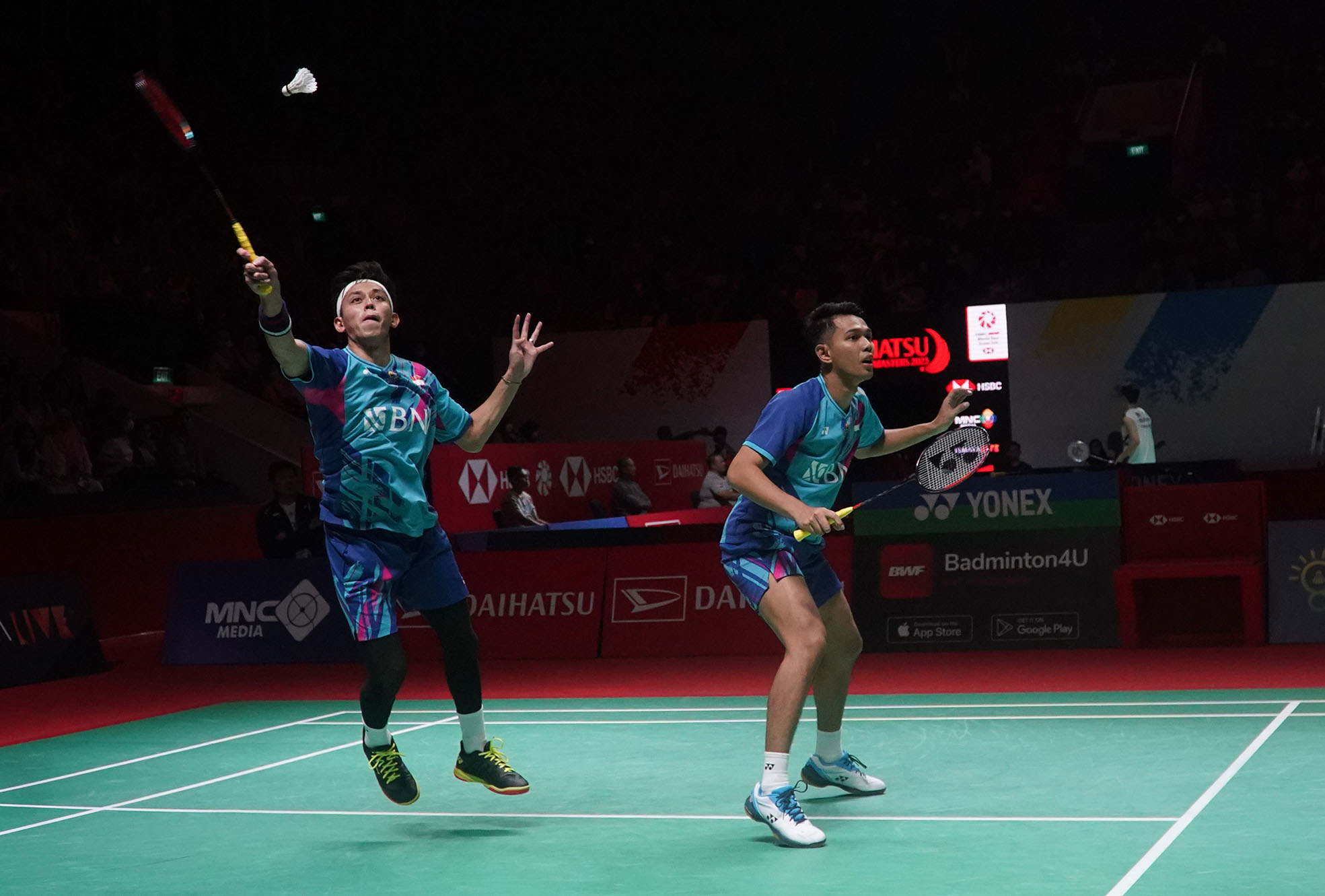Ganda putra Indonesia, Fajar Alfian/Muhammad Rian Ardianto berhasil mengalahkan ganda putra Chinese Taipei, Chang Ko-Chi/Po Li-Wei melalui pertarungan tiga gim, 13-21, 21-9 dan 21-14 pada babak kedua gelaran Daihatsu Indonesia Masters 2023, Kamis (26/1), di Istora Senayan Jakarta. (Foto : HO/Humas PP PBSI/Erly Bahtiar/Sportsmoment)