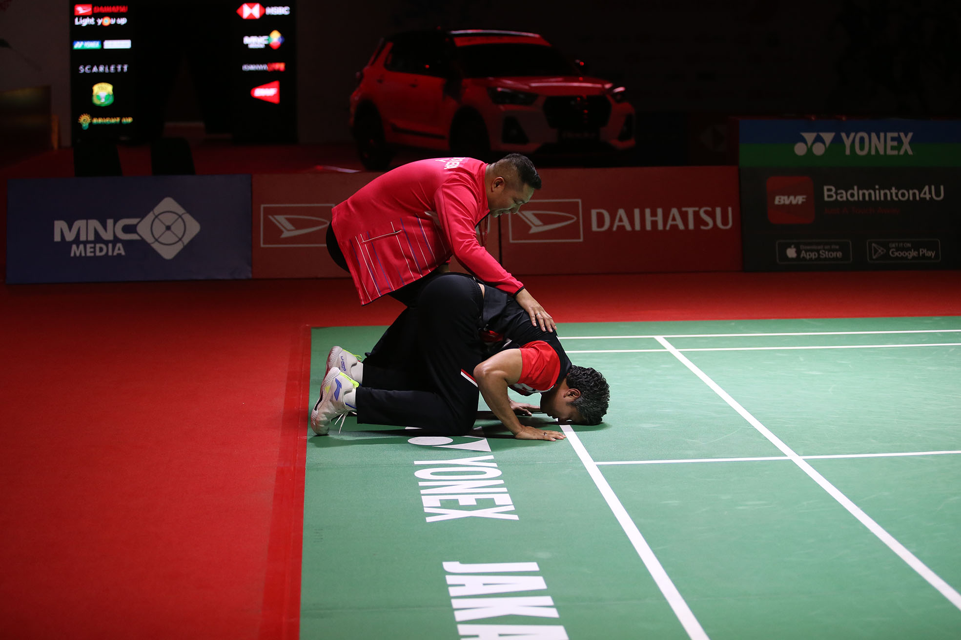 Sujud syukur coach Irwansyah bersama coach Harry Hartono seusai Chico Aura Dwi Wardoyo berhasil memenangkan pertandingan semifinal Daihatsu Indonesia Masters 2023, Sabtu (28/1). (Foto : HO/Humas PP PBSI/Erly Bahtiar/Sportsmoment)