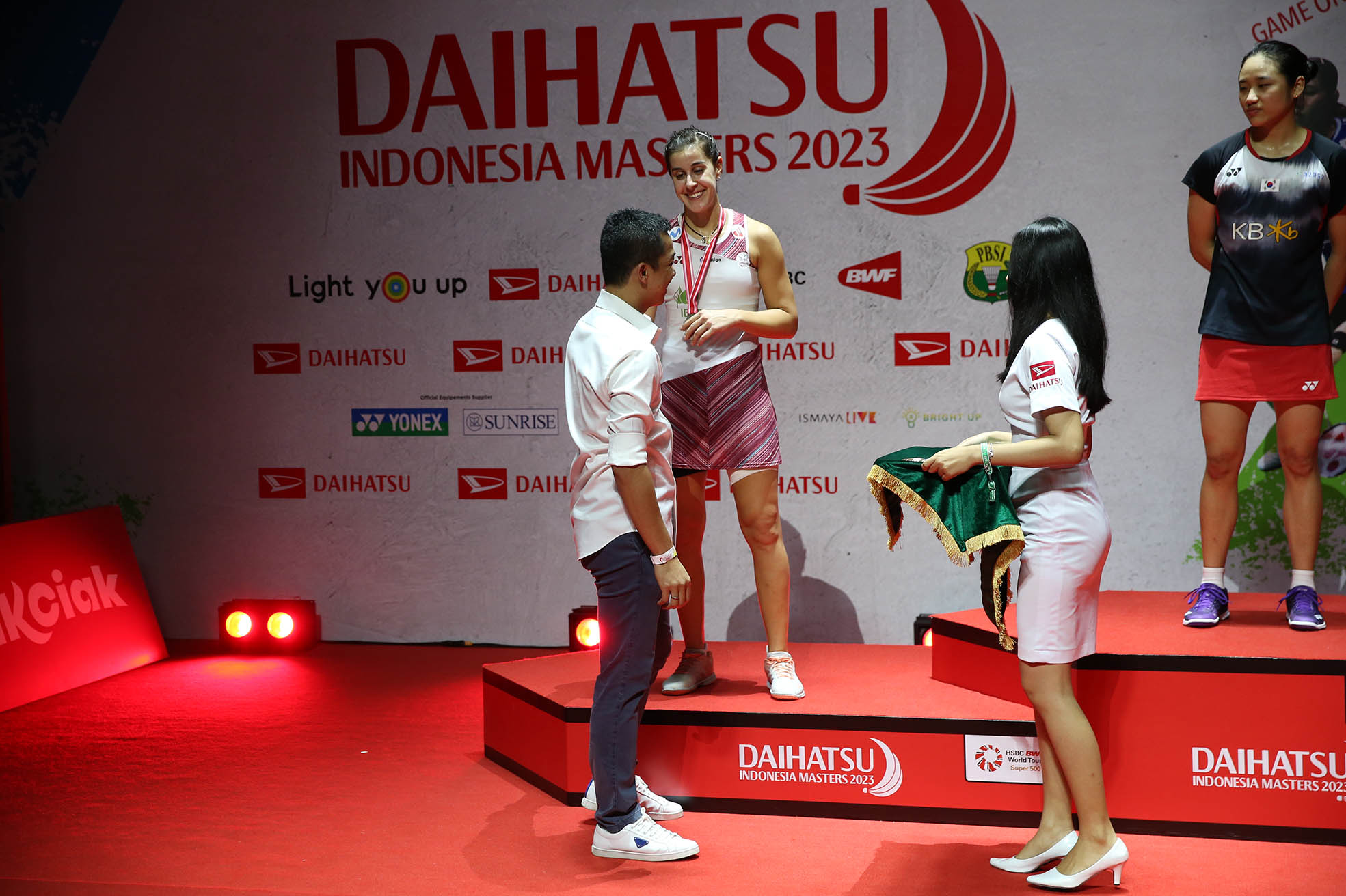 Legenda tunggal putra Indonesia, Taufik Hidayat menyerahkan medali kepada runner up sektor tunggal putri, Carolina Marin (Spanyol) dan juara tunggal putri asal Korea Selatan, An Se Young pada gelaran Daihatsu Indonesia Masters 2023, Minggu (29/1), di Istora Senayan Jakarta. (Foto : HO/Humas PP PBSI/Erly Bahtiar/Sportsmoment)