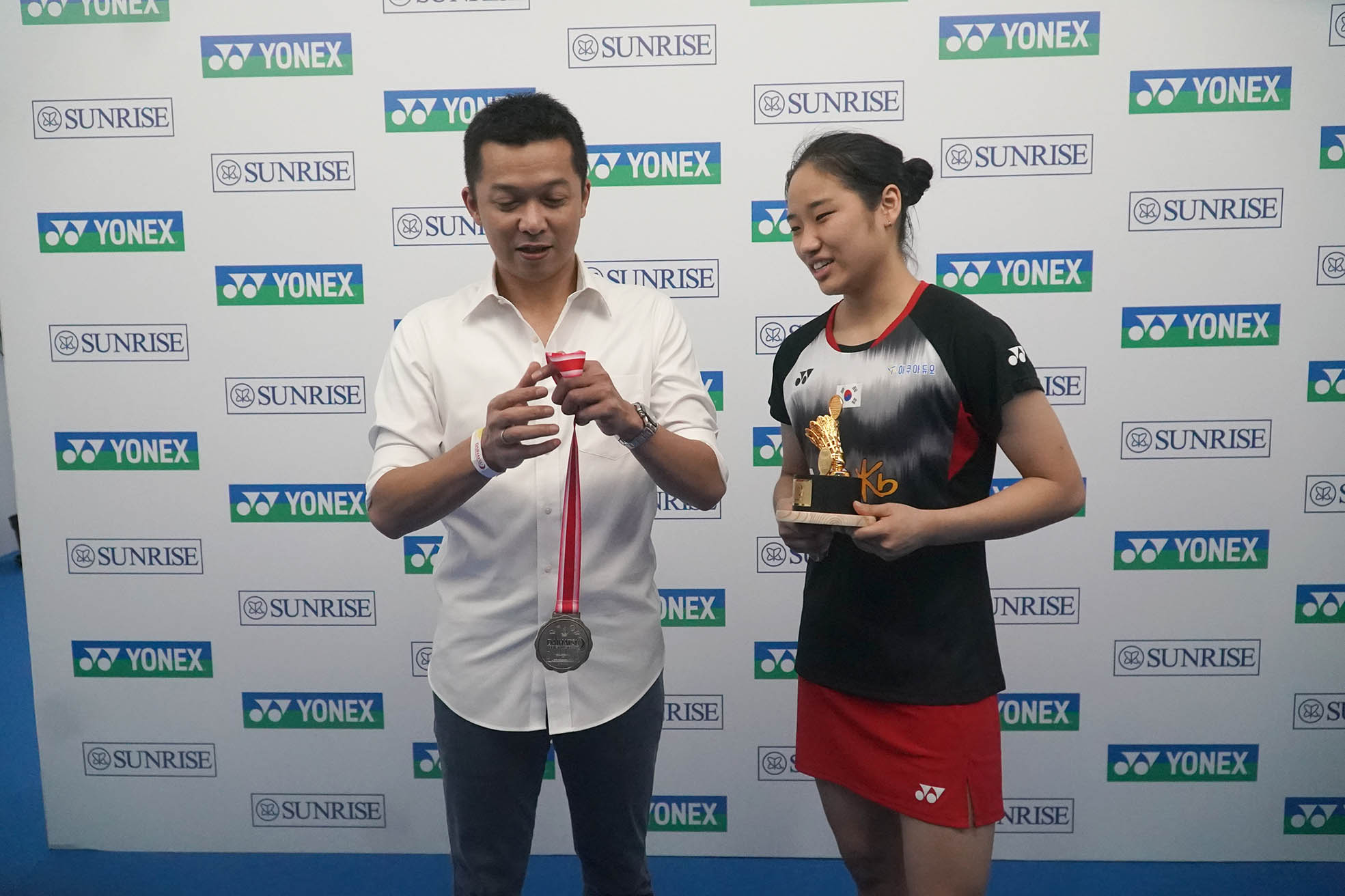 Legenda tunggal putra Indonesia, Taufik Hidayat bersama juara Daihatsu Indonesia Masters 2023 sektor tunggal putri asal Korea Selatan An Se Young, Minggu (29/1), di Istora Senayan Jakarta. (Foto : HO/Humas PP PBSI/Erly Bahtiar/Sportsmoment)