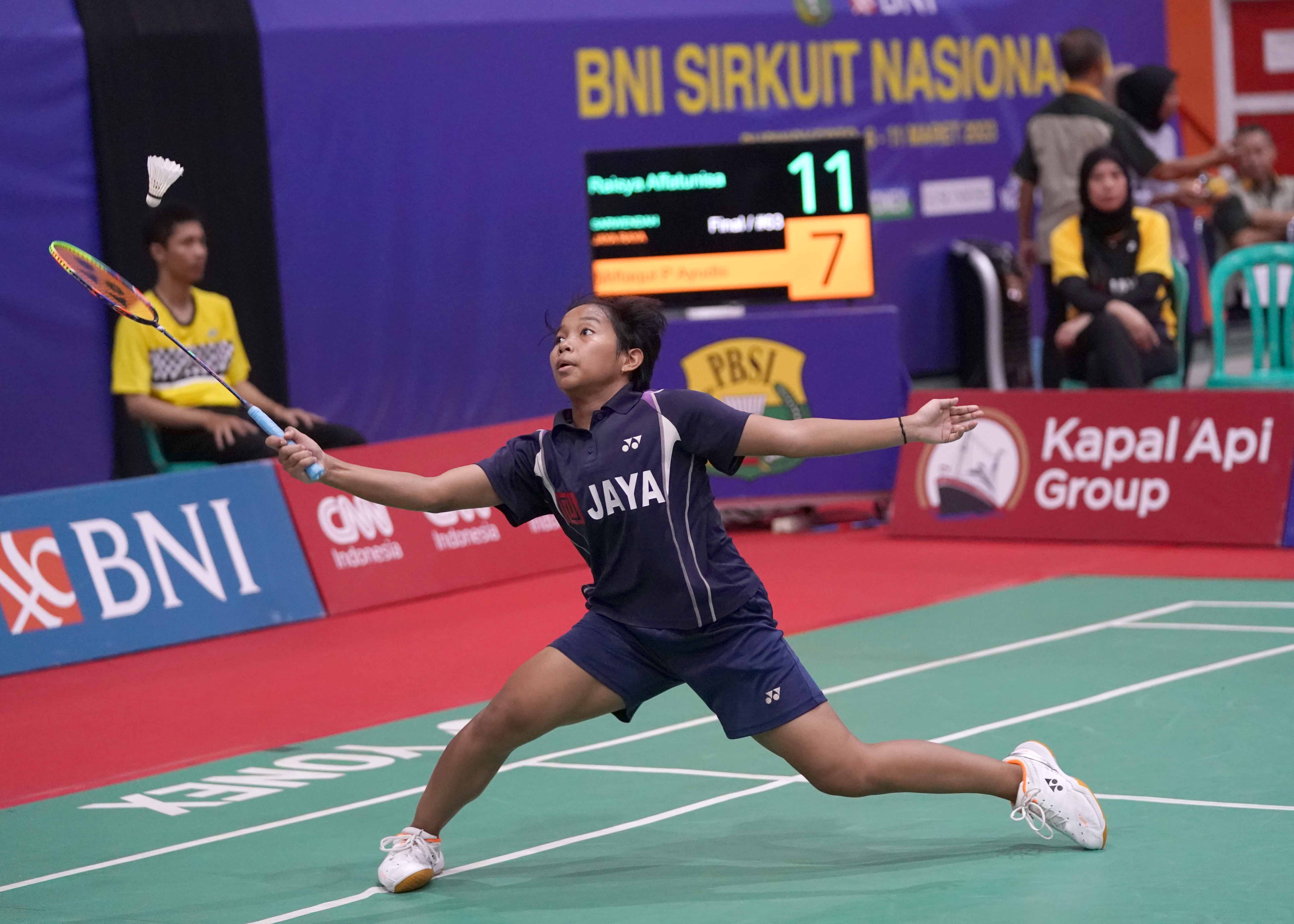 Tunggal pemula putri asal klub PB. Jaya Raya, Miftaqul Putri Ayudis dikalahkan tunggal pemula putri asal Sarwendah Badminton Club, Raisya Affatunisa dengan dua gim langsung, 11-21 dan 13-21 pada partai final gelaran Sirkuit Nasional Jawa Tengah yang diselenggarakan di GOR Satria, Purwokerto, Sabtu (11/3). (Foto by : sportsmoment.id)