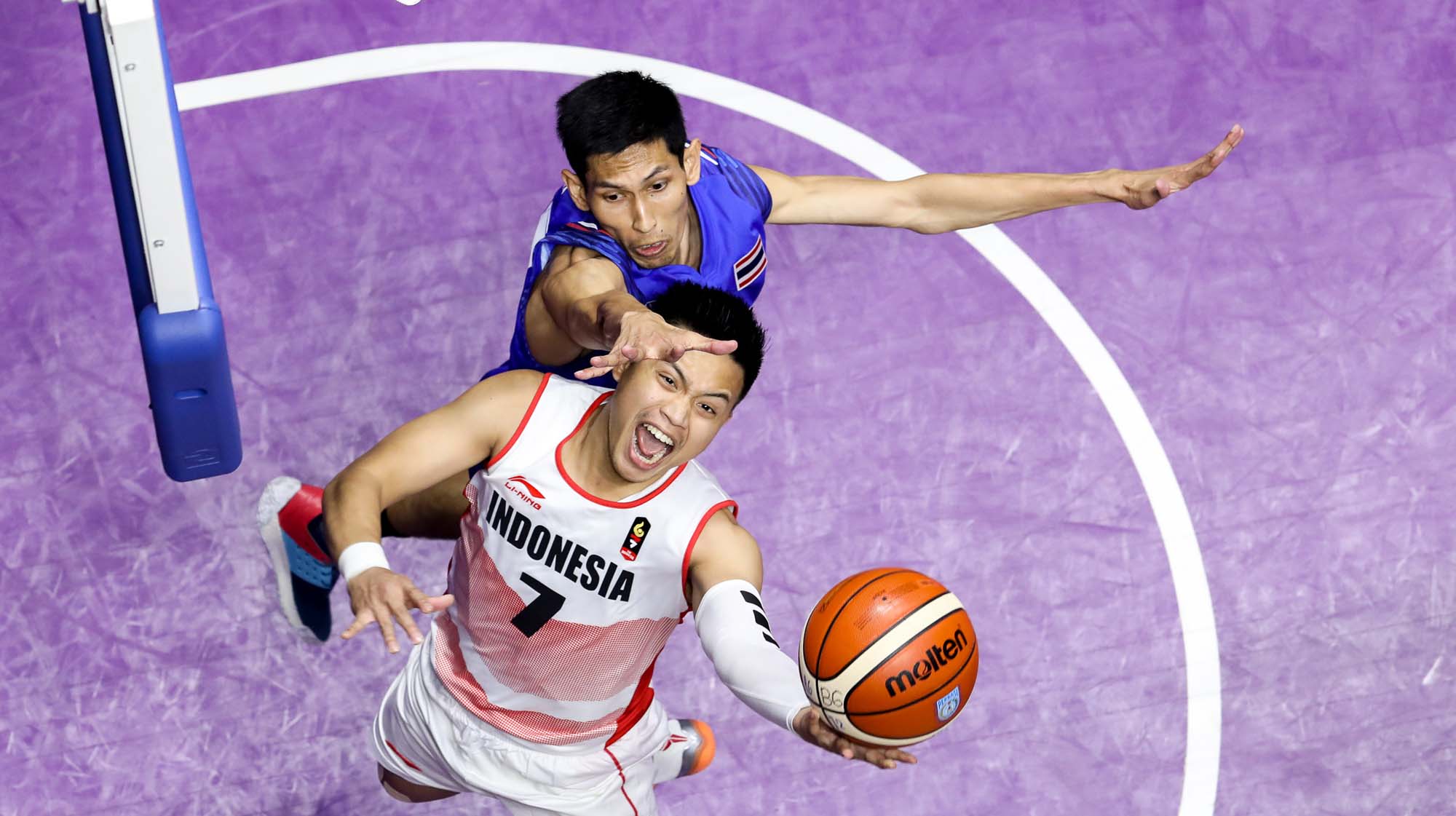 Pebasket Indonesia Andakara Prastawa (bawah) melakukan Lay-up melewati pemain Thailand Chitchai Ananti di pertandingan babak penyisihan Grup A Asian Games ke 18 di Hall Basket Senayan, Jakarta Senin (20/8). INASGOC/Wahyudin