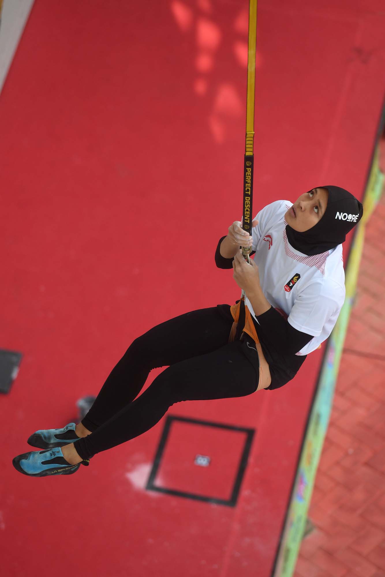Atlet panjat tebing Indonesia Aries Susanti Rahayu mengulur tali pengaman pada babak kualifikasi speed putri di Arena Panjat Tebing Jakabaring Sport City, Palembang, Sumatera Selatan, Kamis (23/8). INASGOC/Hendra Nurdiyansyah