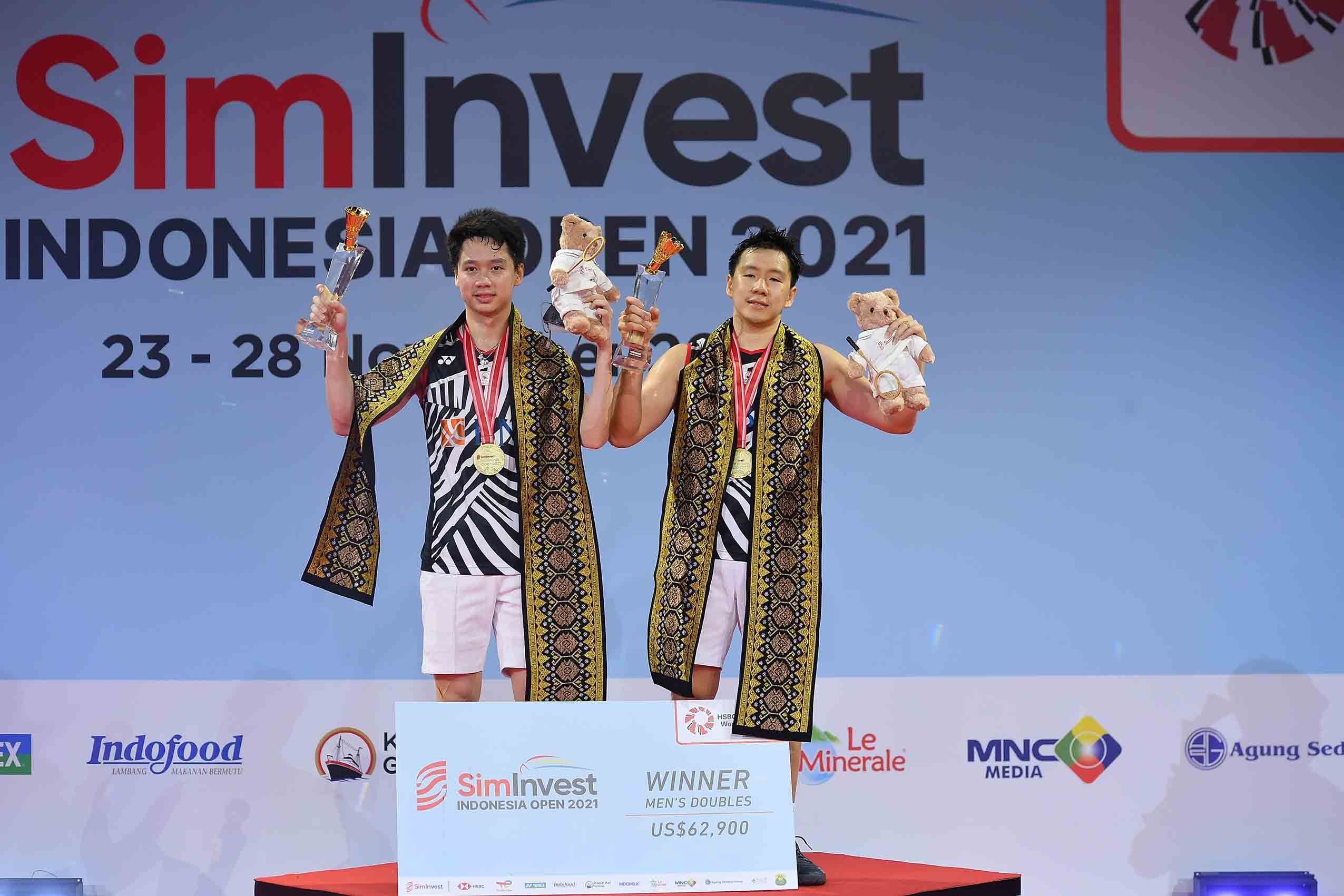 Podium juara sektor ganda putra gelaran SimInvest Indonesia Open 2021, Minggu (28/11) di Bali International Convention Center di Nusa Dua, Bali. Juara sektor ganda putra, Marcus Fernaldi Gideon/Kevin Sanjaya Sukamuljo (Indonesia). (Foto : HO/Humas PP PBSI/Sportsmoment.id)