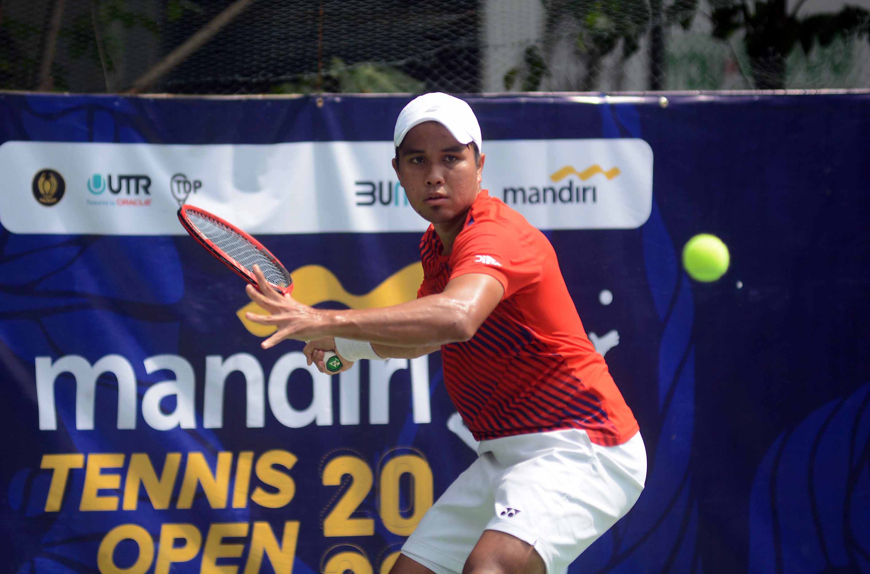 Petenis Jawa Timur, M. Rifqi Fitriadi berupaya mengembalikan bola lawan dalam pertandingan babak pertama turnamen nasional Mandiri Tennis Open 2022 di lapangan tenis The Sultan Hotel & Residence Jakarta, Rabu 9 Februari 2022. Unggulan pertama tunggal putra itu berhasil mengalahkan sesama wakil Jatim, Renaldi Aqila 6-1 6-2.