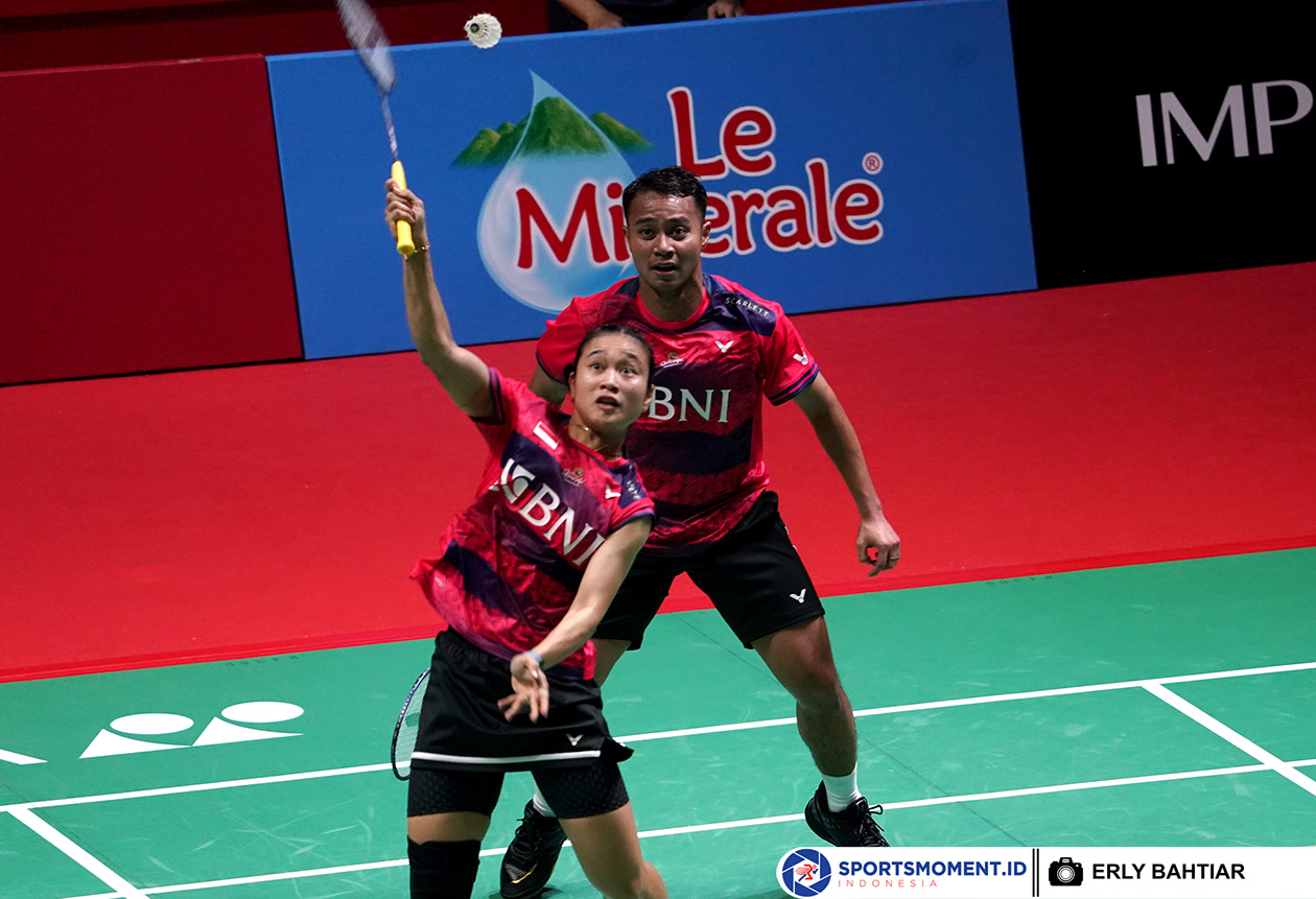 Ganda campuran Indonesia, Rehan Naufal Kusharjanto/Lisa Ayu Kusumawati berhasil mengalahkan unggulan ketujuh asal Malaysia, Goh Soon Huat/Lai Shevon Jemie melalui pertarungan tiga gim, 13-21, 26-24, 21-17 pada babak pertama gelaran Kapal Api Group Indonesia Open 2023 di Istora Senayan Jakarta, Selasa (13/6). ( Foto : HO/Humas PP PBSI/Erly Bahtiar/Sportsmoment )