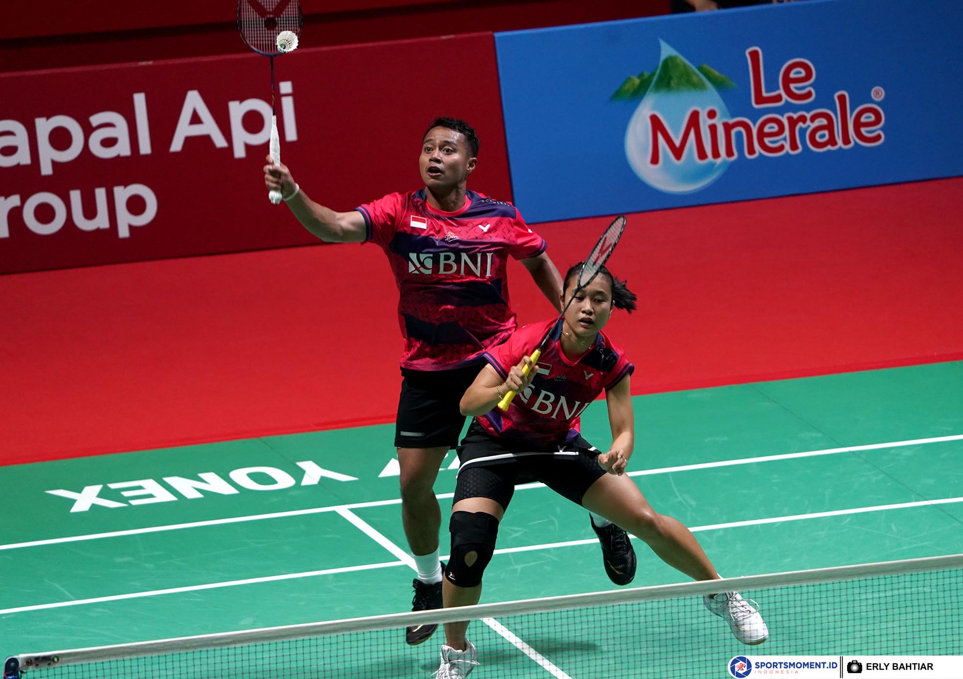 Ganda campuran Indonesia, Rehan Naufal Kusharjanto/Lisa Ayu Kusumawati berhasil mengalahkan unggulan ketujuh asal Malaysia, Goh Soon Huat/Lai Shevon Jemie melalui pertarungan tiga gim, 13-21, 26-24, 21-17 pada babak pertama gelaran Kapal Api Group Indonesia Open 2023 di Istora Senayan Jakarta, Selasa (13/6). ( Foto : HO/Humas PP PBSI/Erly Bahtiar/Sportsmoment )
