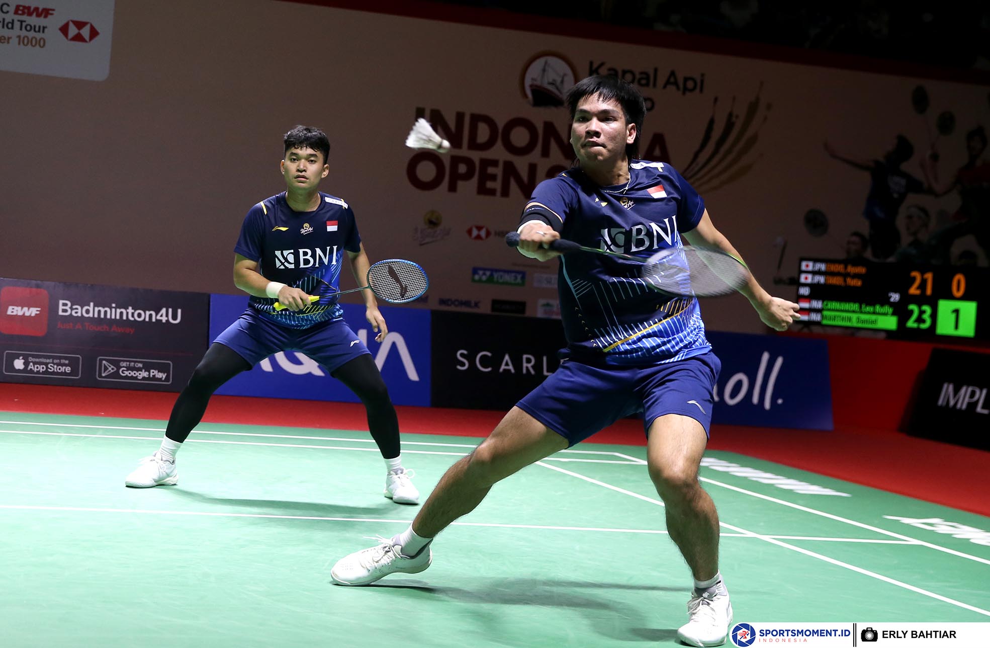 Ganda putra Indonesia, Leo Rolly Carnando/Daniel Marthin berhasil mengalahkan ganda putra Jepang, Ayato Endo/Yuta Takei melalui pertarungan tiga gim, 23-21, 8-21, 21-12 pada babak pertama gelaran Kapal Api Group Indonesia Open 2023 di Istora Senayan Jakarta, Selasa (13/6). ( Foto : HO/Humas PP PBSI/Erly Bahtiar/Sportsmoment )