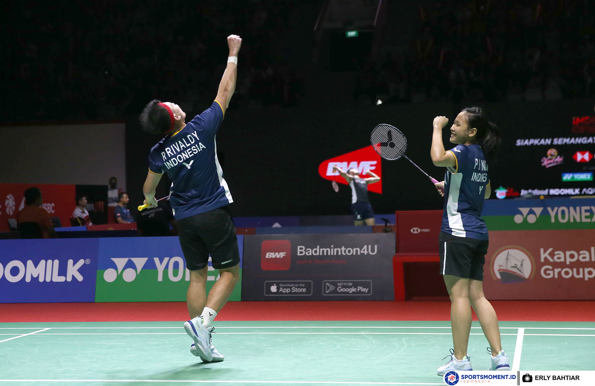 Ganda campuran Indonesia, Rinov Rivaldy/Pitha Haningtyas Mentari berhasil mengalahkan unggulan kelima asal Prancis, Thom Gicquel/Delphine Delrue dua gim langsung, 21-14, 21-15 pada babak pertama gelaran Kapal Api Group Indonesia Open 2023 di Istora Senayan Jakarta, Rabu (14/6). ( Foto : HO/Humas PP PBSI/Erly Bahtiar/Sportsmoment )