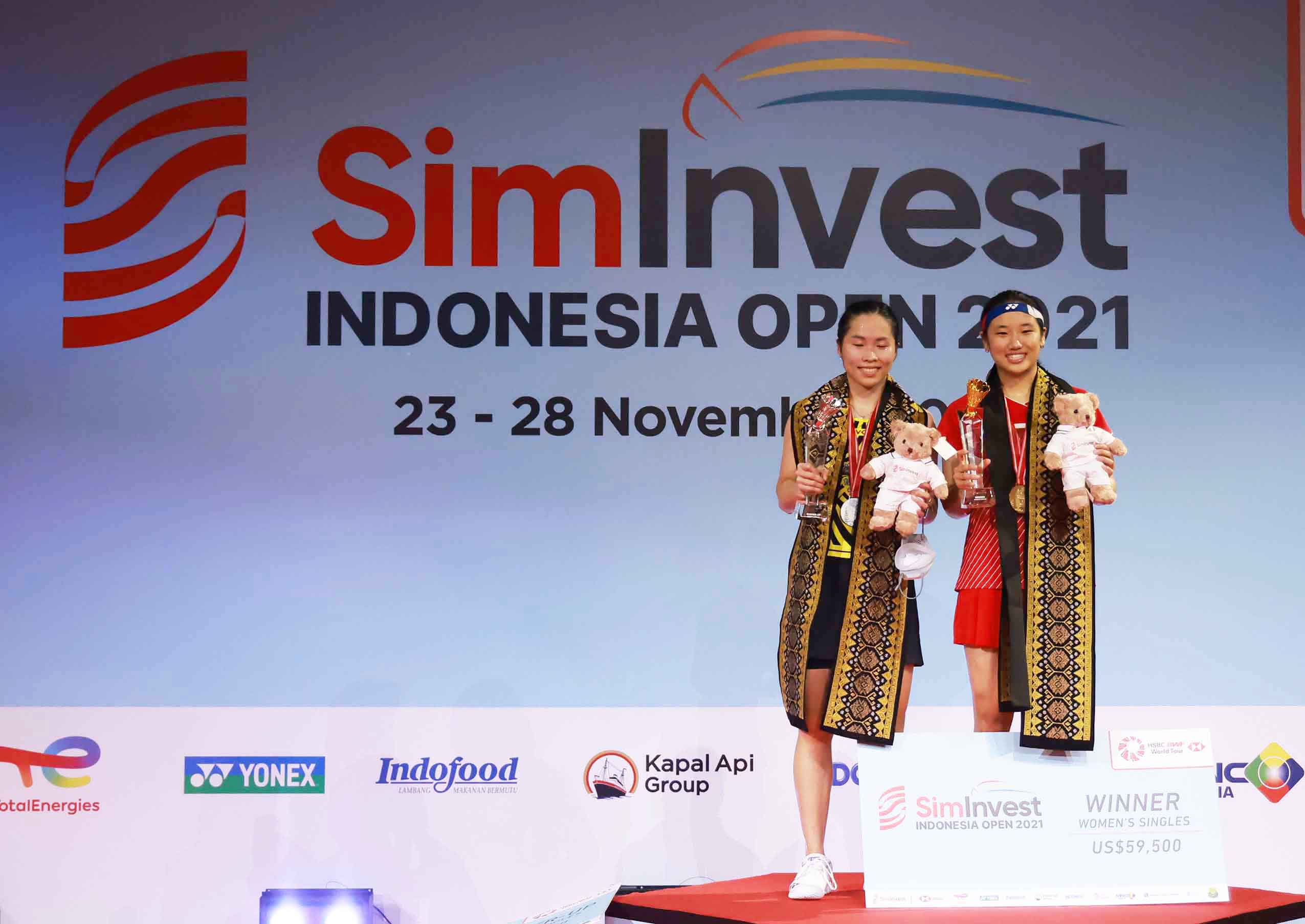 Podium juara sektor tunggal putri gelaran SimInvest Indonesia Open 2021, Minggu (28/11) di Bali International Convention Center di Nusa Dua, Bali. Juara sektor tunggal putri, An Seyoung (Korea Selatan) dan Ratchanok Intanon dari Thailand sebagai runner up. (Foto : HO/Humas PP PBSI/Sportsmoment.id)