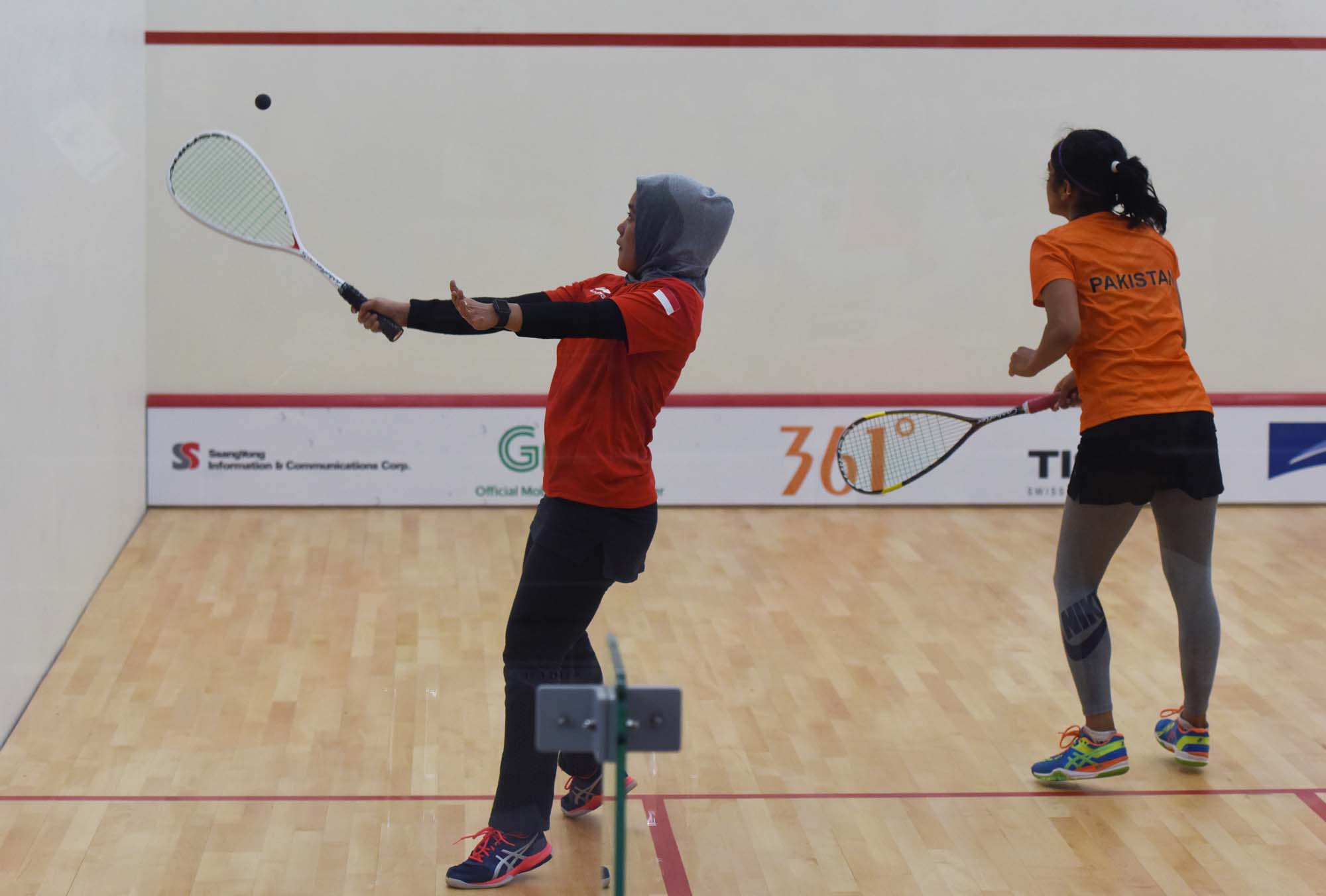 Pemain Squash Indonesia Catur Yuliana (kiri) memukul bola saat bertanding dengan pemain Squash Pakistan Faiza Zafar pada babak 32 besar Squash tunggal putri Asian Games 2018 di Stadion Squash Gelora Bung Karno (GBK-Squash Stadium), Jakarta, Kamis (23/8). INASGOC/Sakti Karuru
