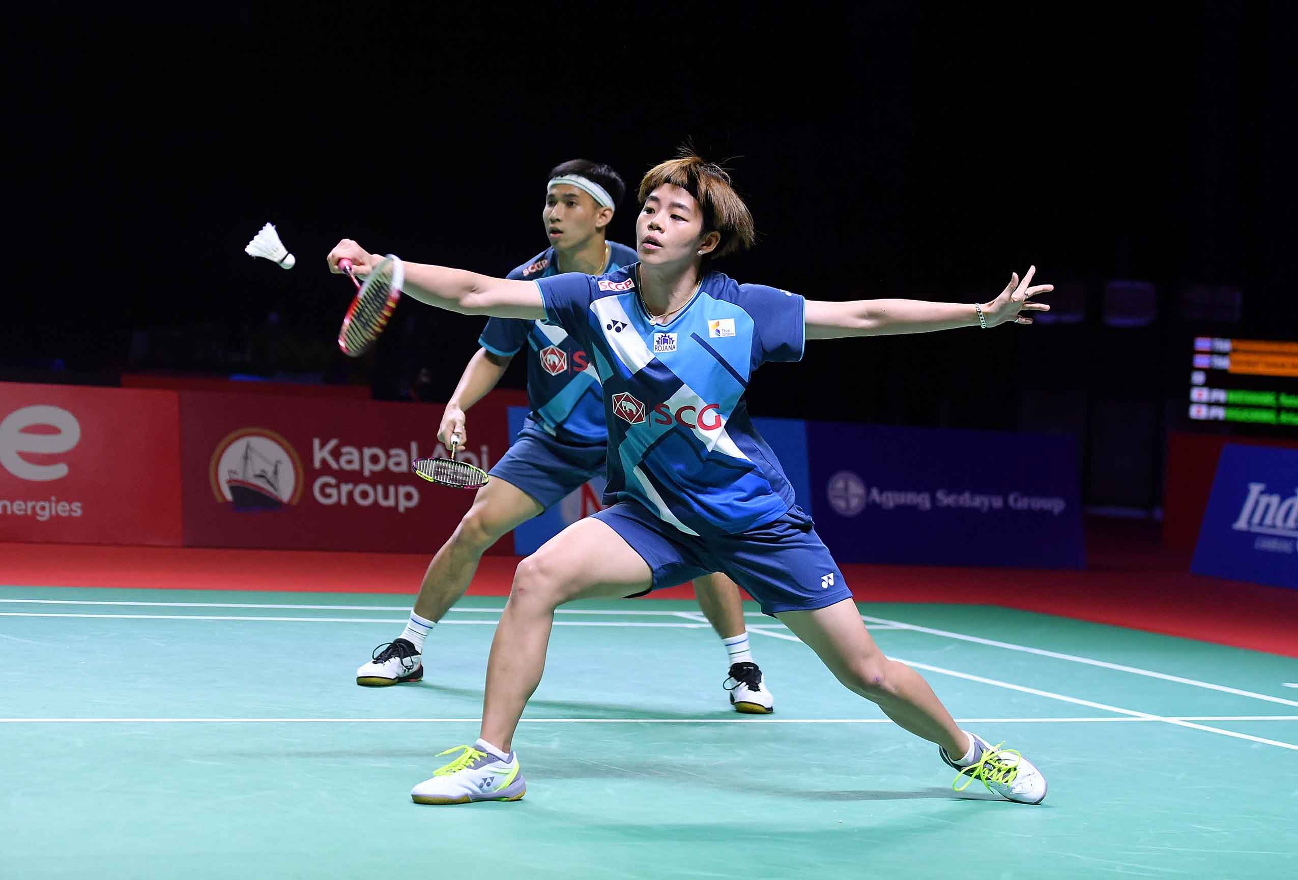 Ganda campuran Thailand, Dechapol Puavaranukroh/Sapsiree Taerattanachai pada laga puncak gelaran SimInvest Indonesia Open 2021, Minggu (28/11) di Bali International Convention Center di Nusa Dua, Bali. (Foto : HO/Humas PP PBSI/Sportsmoment.id)