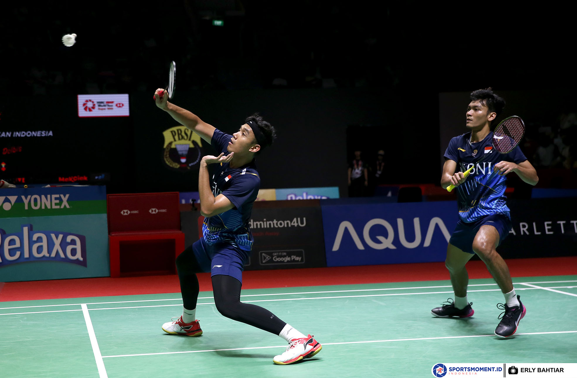 Ganda putra Indonesia, Muhammad Shohibul Fikri/Bagas Maulana dikalahkan ganda putra asal Malaysia, Aaron Chia/Soh Wooi Yik dua gim langsung, 16-21, 12-21 pada babak pertama gelaran Kapal Api Group Indonesia Open 2023 di Istora Senayan Jakarta, Rabu (14/6). ( Foto : HO/Humas PP PBSI/Erly Bahtiar/Sportsmoment )