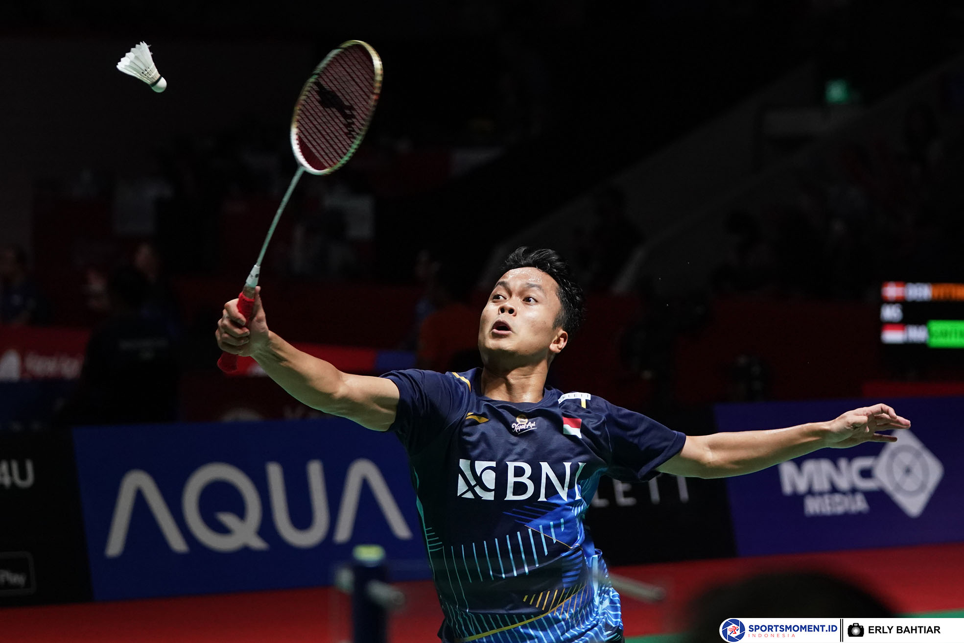 Tunggal putra Indonesia, Anthony Sinisuka Ginting berhasil mengalahkan tunggal putra asal Denmark, Hans Kristian Solberg Vittinghus dua gim langsung, 21-8, 21-10 pada babak pertama gelaran Kapal Api Group Indonesia Open 2023 di Istora Senayan Jakarta, Rabu (14/6). ( Foto : HO/Humas PP PBSI/Erly Bahtiar/Sportsmoment )