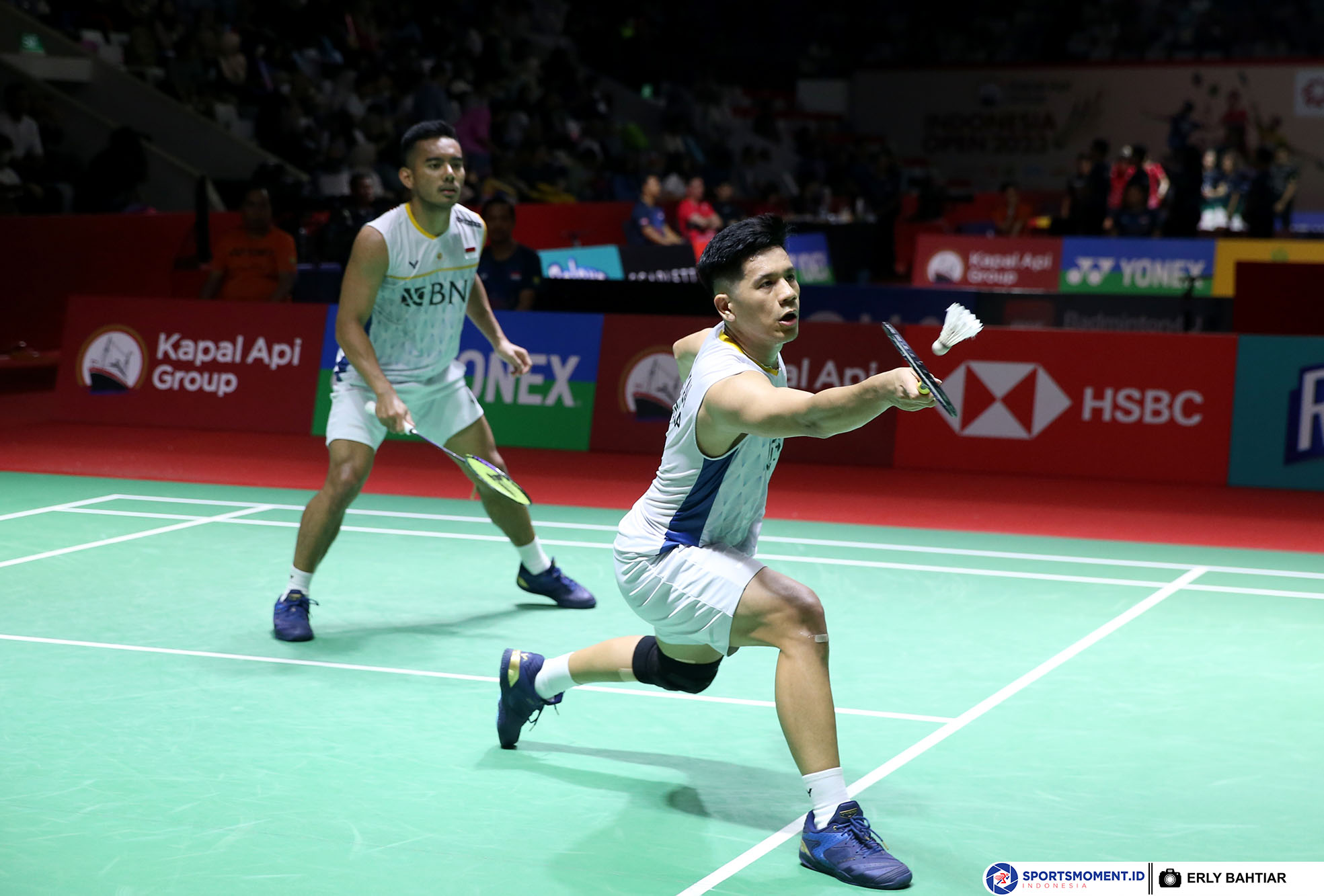 Ganda putra Indonesia, Pramudya Kusumawardana/Yeremia Erich Yoche Yacob Rambitan berhasil mengalahkan ganda putra asal Inggris, Ben Lane/Sean Vendy melalui pertarungan tiga gim, 21-15, 13-21, 21-14 pada babak pertama gelaran Kapal Api Group Indonesia Open 2023 di Istora Senayan Jakarta, Rabu (14/6). ( Foto : HO/Humas PP PBSI/Erly Bahtiar/Sportsmoment )