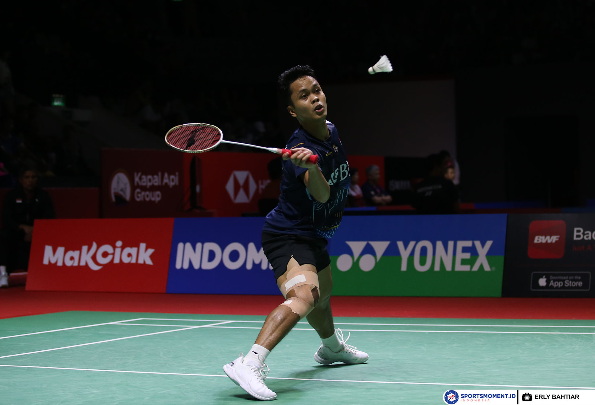 Tunggal putra Indonesia, Anthony Sinisuka Ginting berhasil mengalahkan tunggal putra asal India, Priyanshu Rajawat melalui pertarungan tiga gim, 20-22, 21-15, 21-15 pada babak kedua gelaran Kapal Api Group Indonesia Open 2023 di Istora Senayan Jakarta, Kamis (15/6). ( Foto : HO/Humas PP PBSI/Erly Bahtiar/Sportsmoment )
