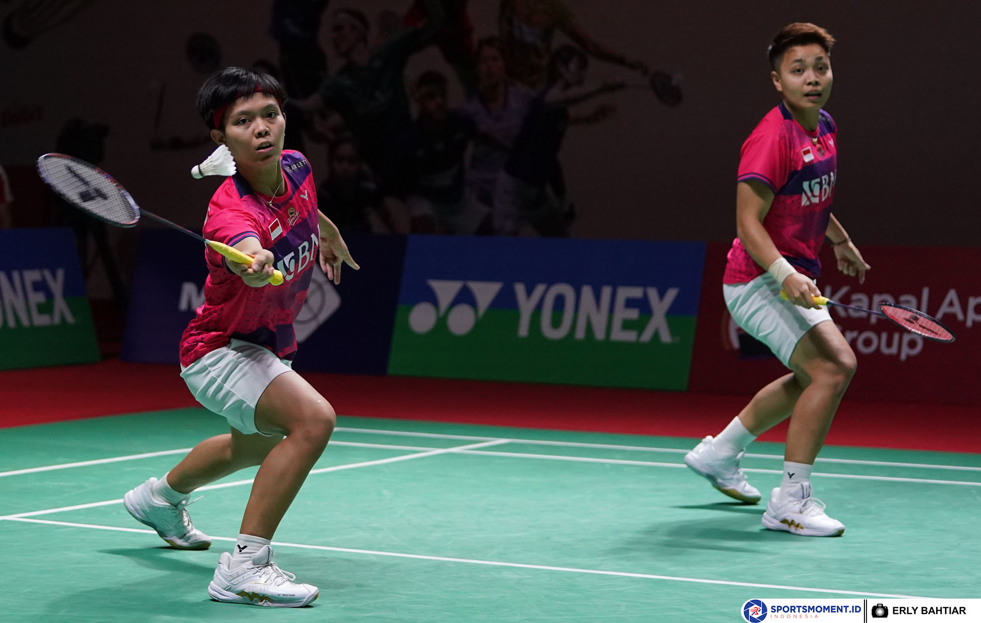 Ganda putri Indonesia, Apriyani Rahayu/Siti Fadia Silva Ramadhanti berhasil mengalahkan ganda putri asal Kanada, Catherine Choi/Josephine Wu dua gim langsung, 21-13 21-10 pada babak kedua gelaran Kapal Api Group Indonesia Open 2023 di Istora Senayan Jakarta, Kamis (15/6). ( Foto : HO/Humas PP PBSI/Erly Bahtiar/Sportsmoment )