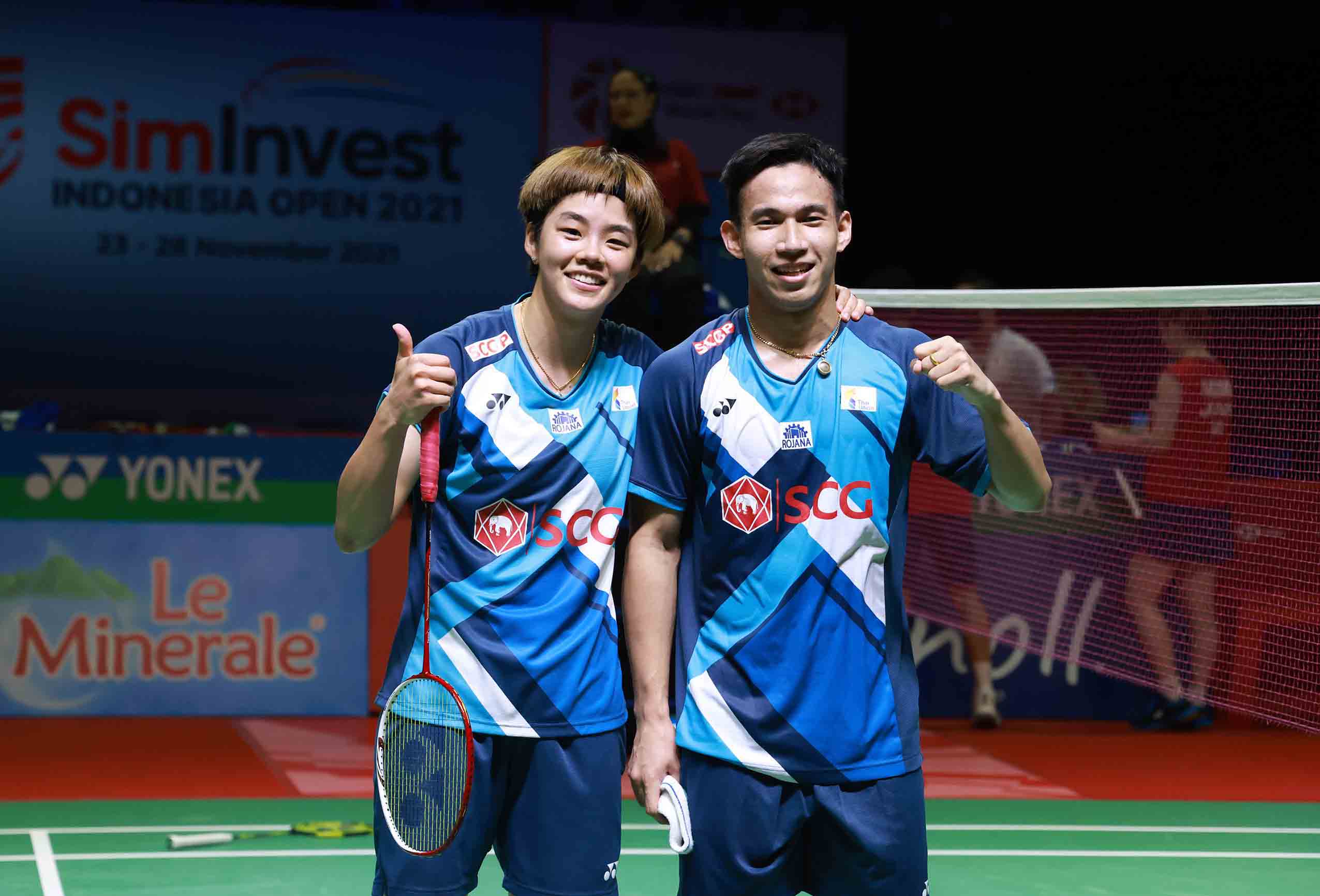 Ganda campuran Thailand, Dechapol Puavaranukroh/Sapsiree Taerattanachai pada laga puncak gelaran SimInvest Indonesia Open 2021, Minggu (28/11) di Bali International Convention Center di Nusa Dua, Bali. (Foto : HO/Humas PP PBSI/Sportsmoment.id)