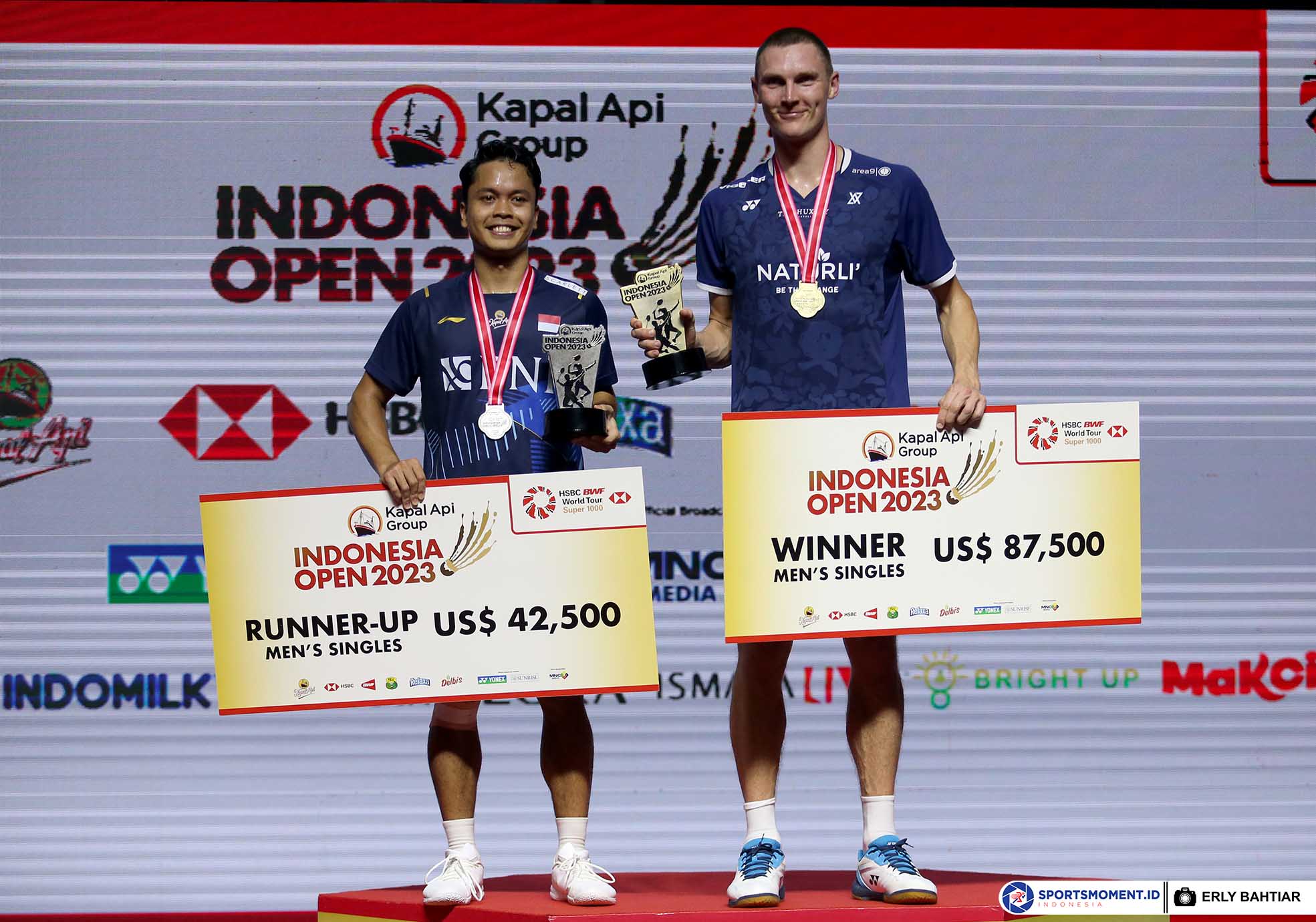 Tunggal putra Indonesia, Anthony Sinisuka Ginting dikalahkan unggulan pertama asal Denmark, Viktor Axelsen dua gim langsung, 14-21, 13-21 pada babak final gelaran Kapal Api Group Indonesia Open 2023 di Istora Senayan Jakarta, Minggu (18/6). ( Foto : HO/Humas PP PBSI/Erly Bahtiar/Sportsmoment )