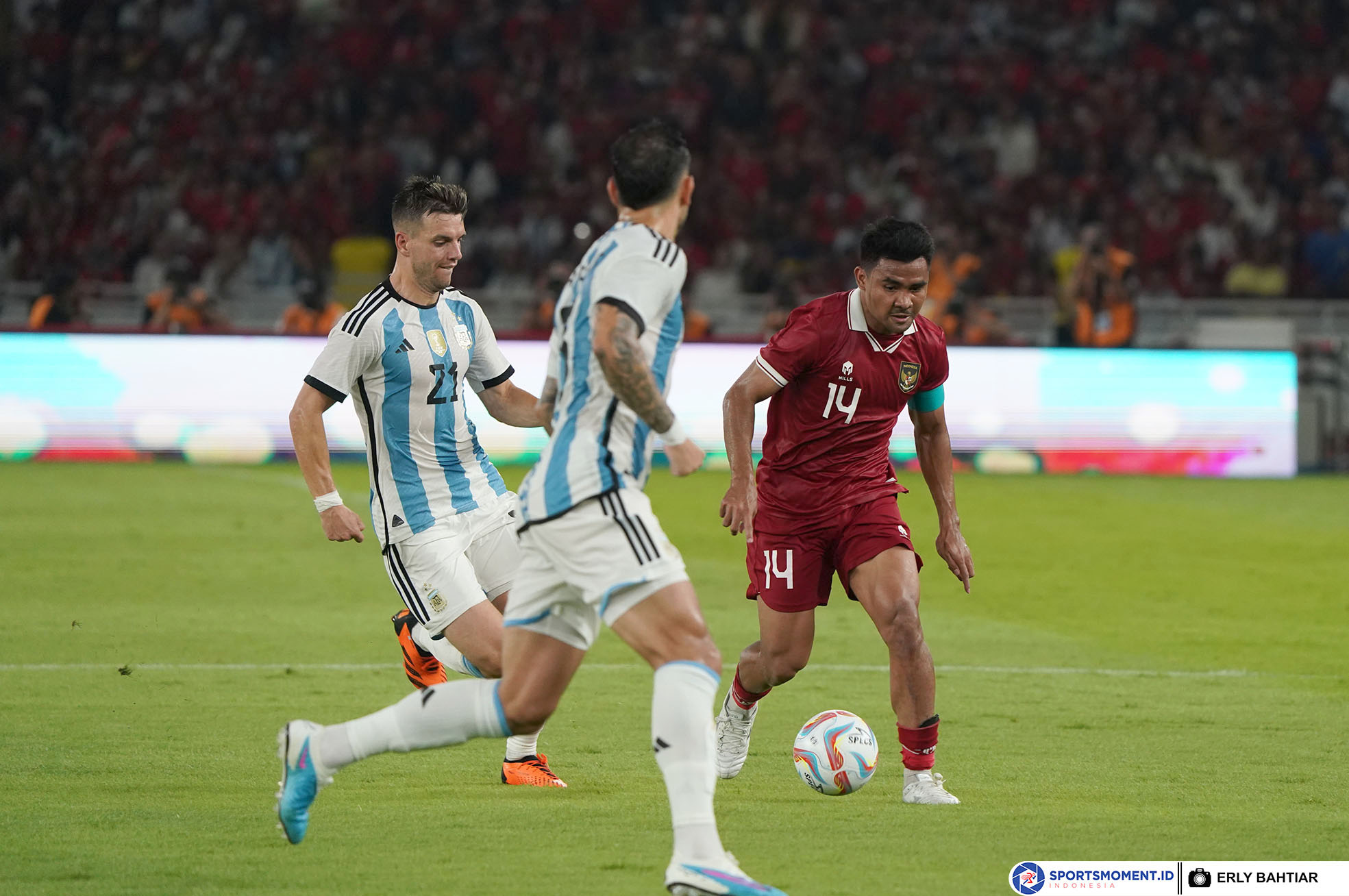 Aksi pesepakbola Timnas Indonesia, Asnawi Mangkualam Bahar (14) saat berhadapan dengan Timnas Argentina pada laga FIFA Matchday, Senin (19/6) di Gelora Bung Karno Senayan Jakarta. Indonesia takluk 0-2 dari Argentina. (Foto : Erly Bahtiar/sportsmoment.id).