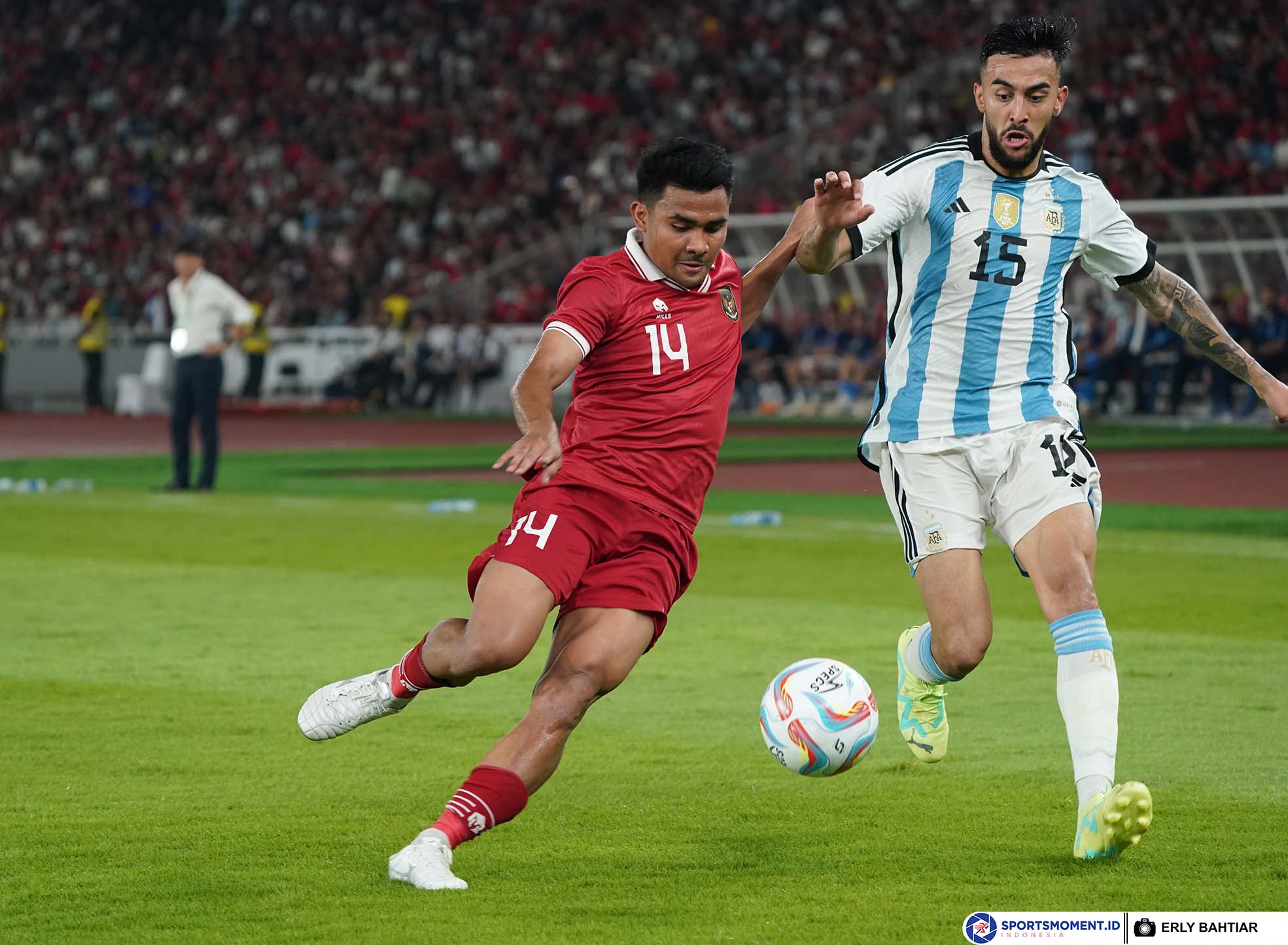 Aksi pesepakbola Timnas Indonesia, Asnawi Mangkualam Bahar (14) saat berhadapan dengan Timnas Argentina pada laga FIFA Matchday, Senin (19/6) di Gelora Bung Karno Senayan Jakarta. Indonesia takluk 0-2 dari Argentina. (Foto : Erly Bahtiar/sportsmoment.id).