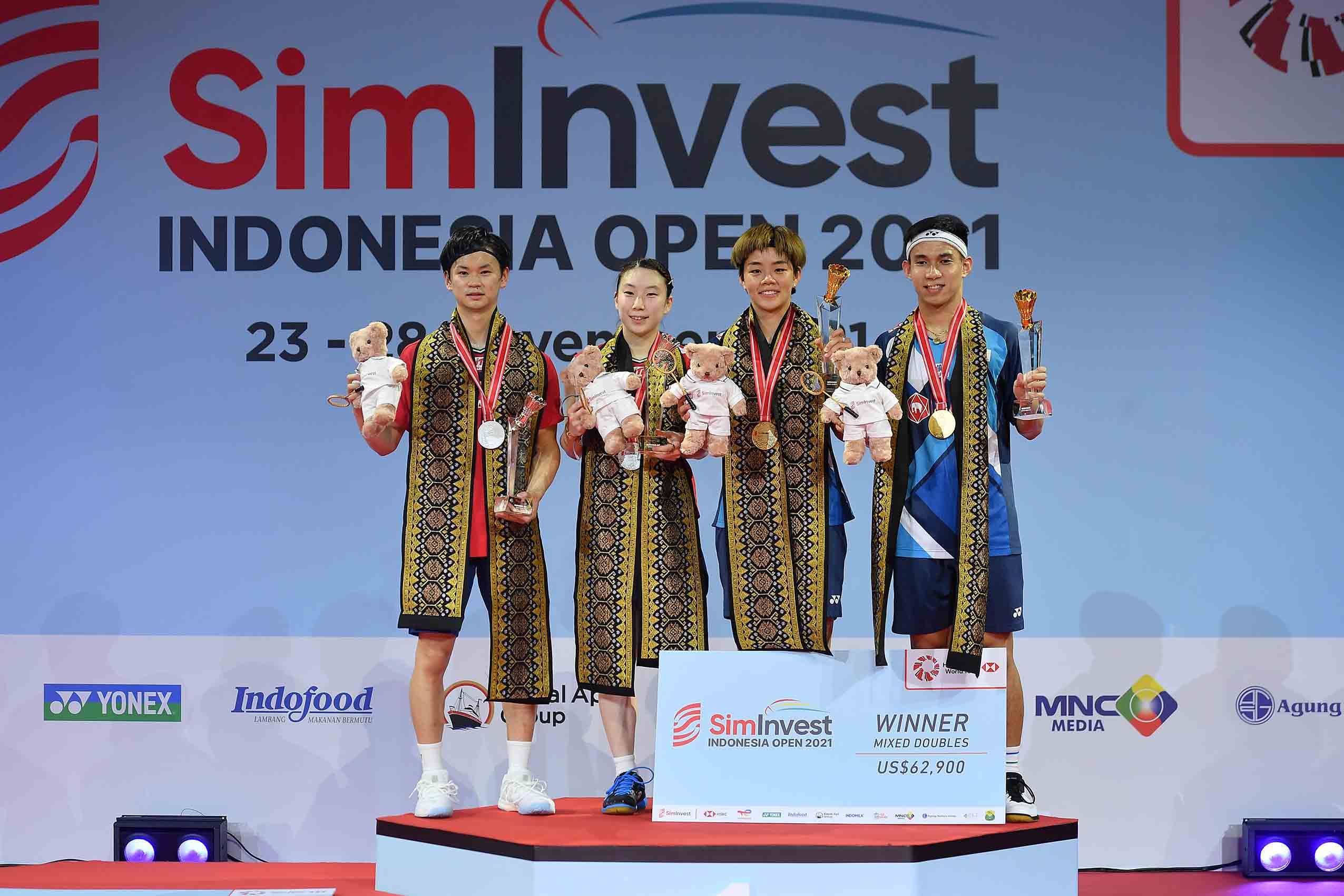 Podium juara sektor ganda campuran gelaran SimInvest Indonesia Open 2021, Minggu (28/11) di Bali International Convention Center di Nusa Dua, Bali. Juara sektor ganda campuran, Dechapol Puavaranukroh/Sapsiree Taerattanachai (Thailand) dan Yuta Watanabe/Arisa Higashino dari Jepang sebagai runner up. (Foto : HO/Humas PP PBSI/Sportsmoment.id)