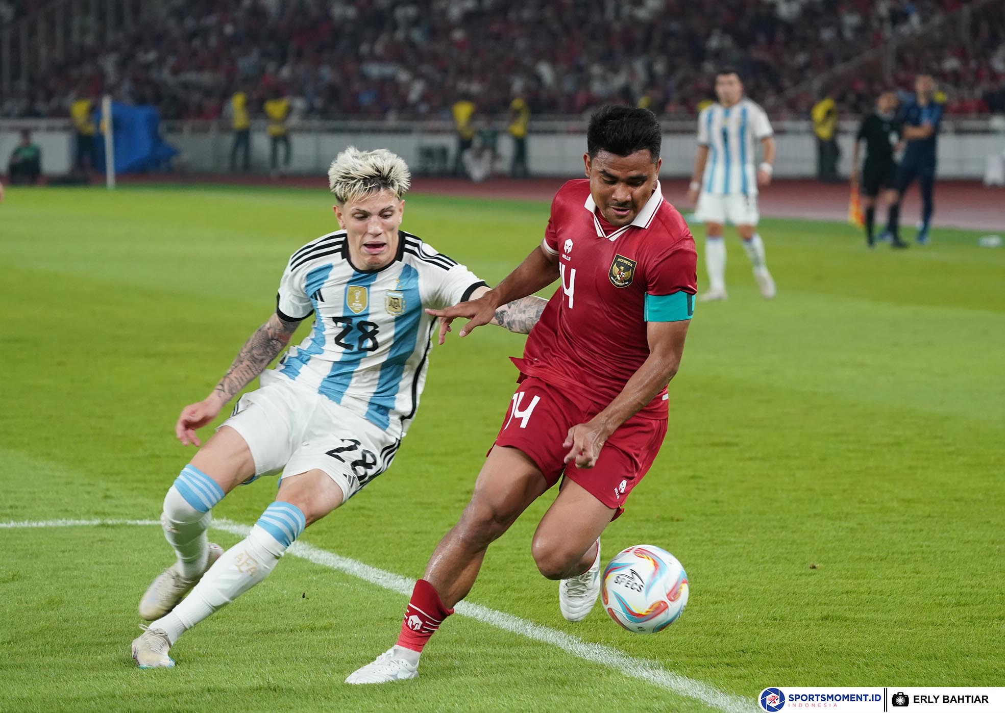 Aksi pesepakbola Timnas Indonesia, Asnawi Mangkualam Bahar (14) saat berhadapan dengan Timnas Argentina pada laga FIFA Matchday, Senin (19/6) di Gelora Bung Karno Senayan Jakarta. Indonesia takluk 0-2 dari Argentina. (Foto : Erly Bahtiar/sportsmoment.id).