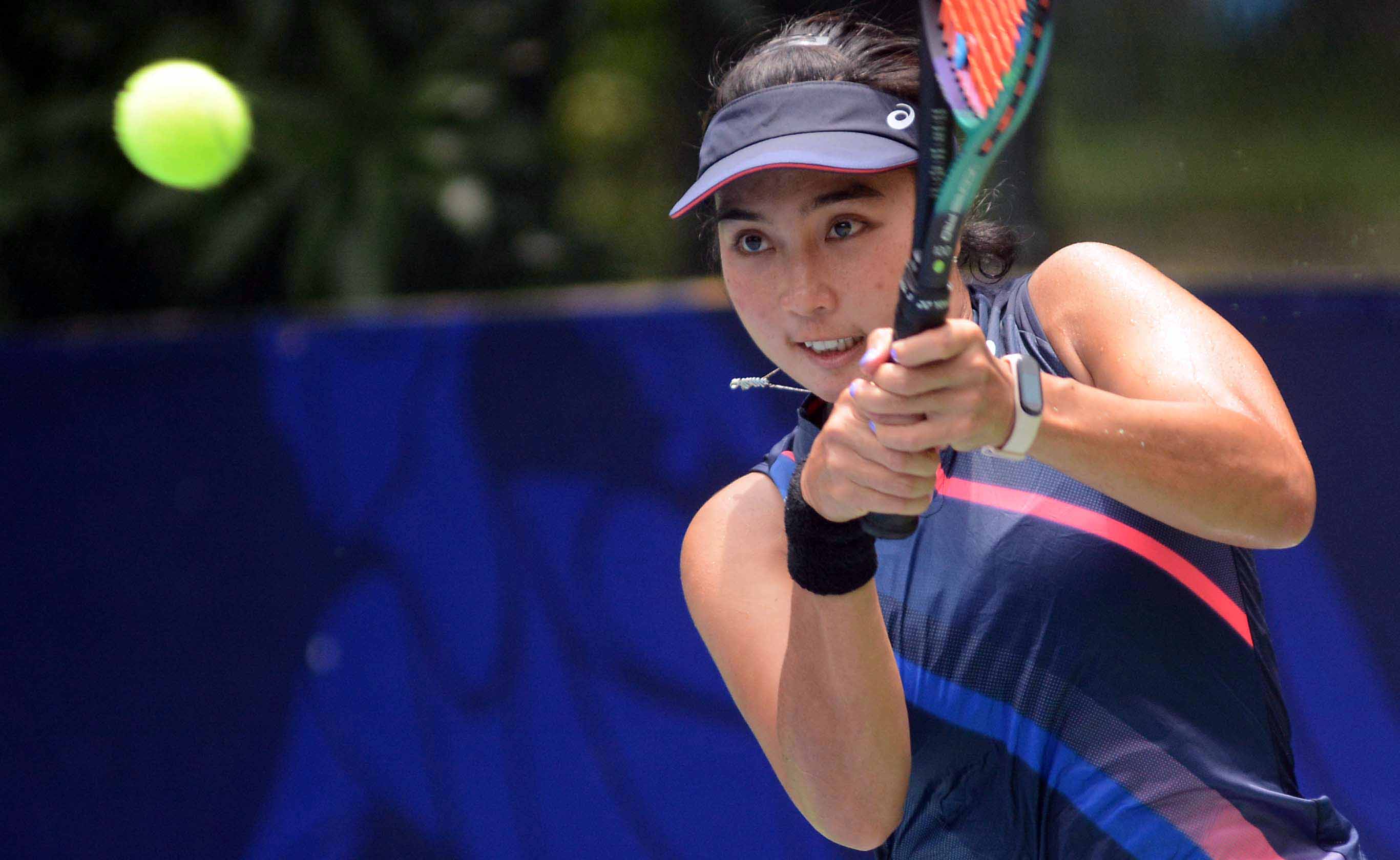 Petenis Jawa Timur, Aldila Sutjiadi dalam pertandingan babak pertama turnamen nasional Mandiri Tennis Open 2022 di lapangan tenis The Sultan Hotel & Residence Jakarta, Rabu 9 Februari 2022. Unggulan pertama tunggal putri itu berhasil mengalahkan Putu Kevalaih (DKI) 6-0 6-0. (Foto :HO/DwiAri Setyadi/tennisindonesia.com/sportsmoment.id)