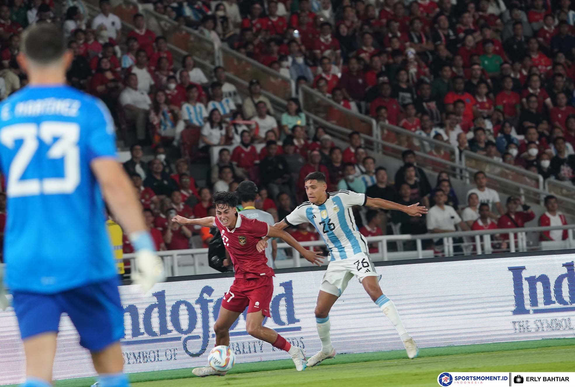 Aksi pesepakbola Timnas Indonesia, Rafael William Struick (Merah) saat berhadapan dengan Timnas Argentina pada laga FIFA Matchday, Senin (19/6) di Gelora Bung Karno Senayan Jakarta. Indonesia takluk 0-2 dari Argentina. (Foto : Erly Bahtiar/sportsmoment.id).