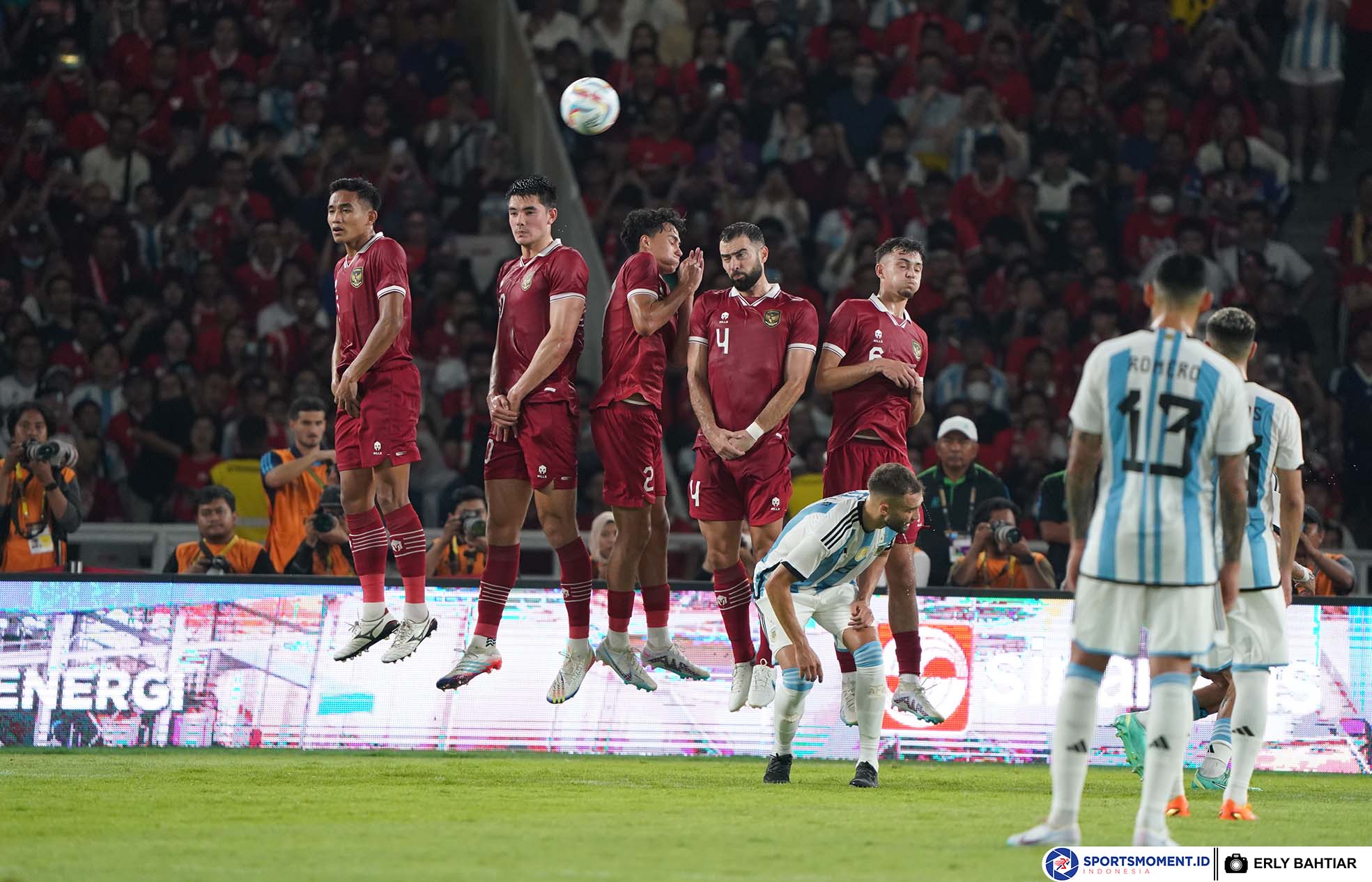 Timnas Indonesia saat berhadapan dengan Timnas Argentina pada laga FIFA Matchday, Senin (19/6) di Gelora Bung Karno Senayan Jakarta. Indonesia takluk 0-2 dari Argentina. (Foto : Erly Bahtiar/sportsmoment.id).