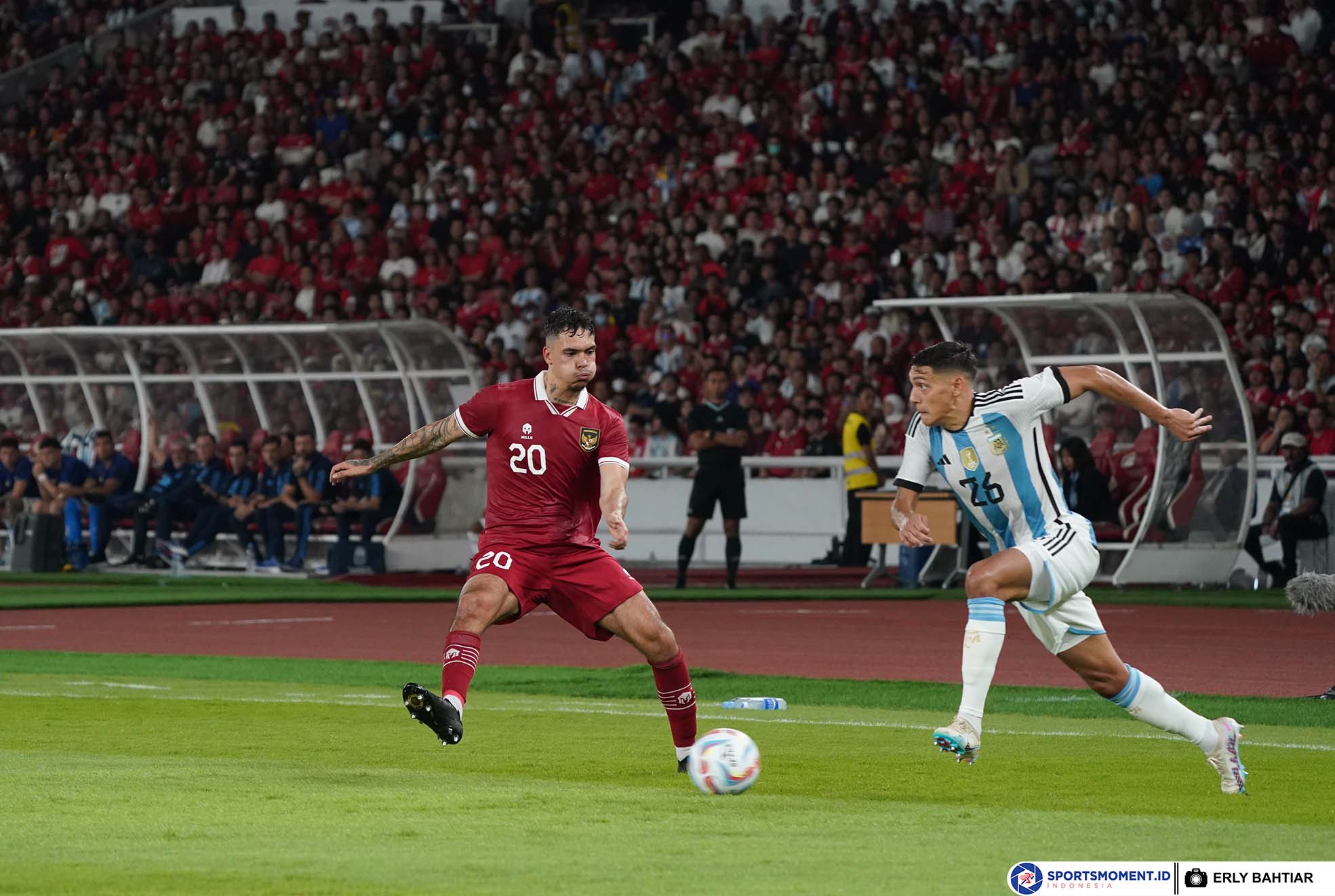 Aksi pesepakbola Timnas Indonesia, Shayne Elian Jay Pattynama (20) saat berhadapan dengan Timnas Argentina pada laga FIFA Matchday, Senin (19/6) di Gelora Bung Karno Senayan Jakarta. Indonesia takluk 0-2 dari Argentina. (Foto : Erly Bahtiar/sportsmoment.id).