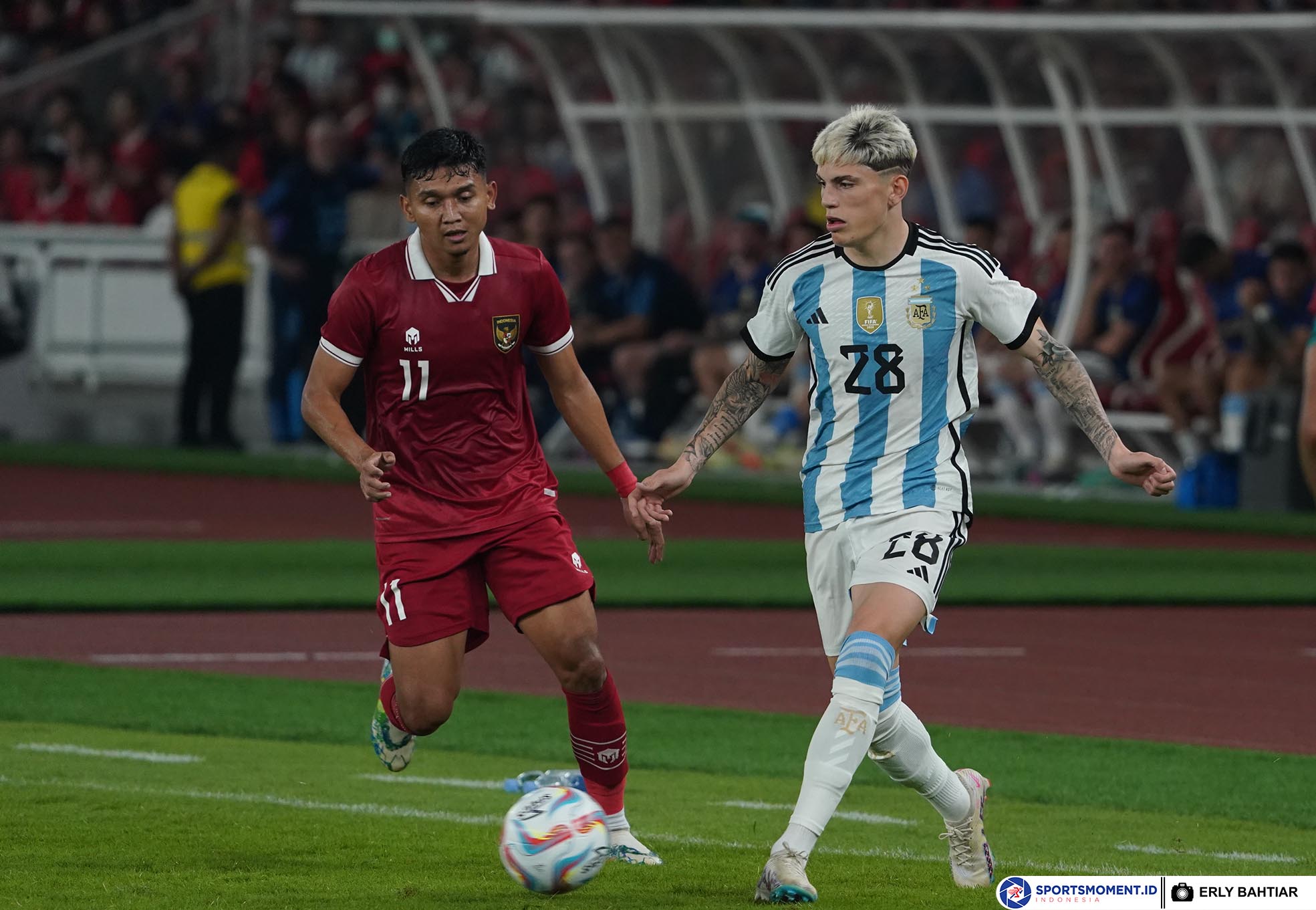Aksi pesepakbola Timnas Indonesia, Dendy Sulistyawan (11) saat berhadapan dengan Timnas Argentina pada laga FIFA Matchday, Senin (19/6) di Gelora Bung Karno Senayan Jakarta. Indonesia takluk 0-2 dari Argentina. (Foto : Erly Bahtiar/sportsmoment.id).