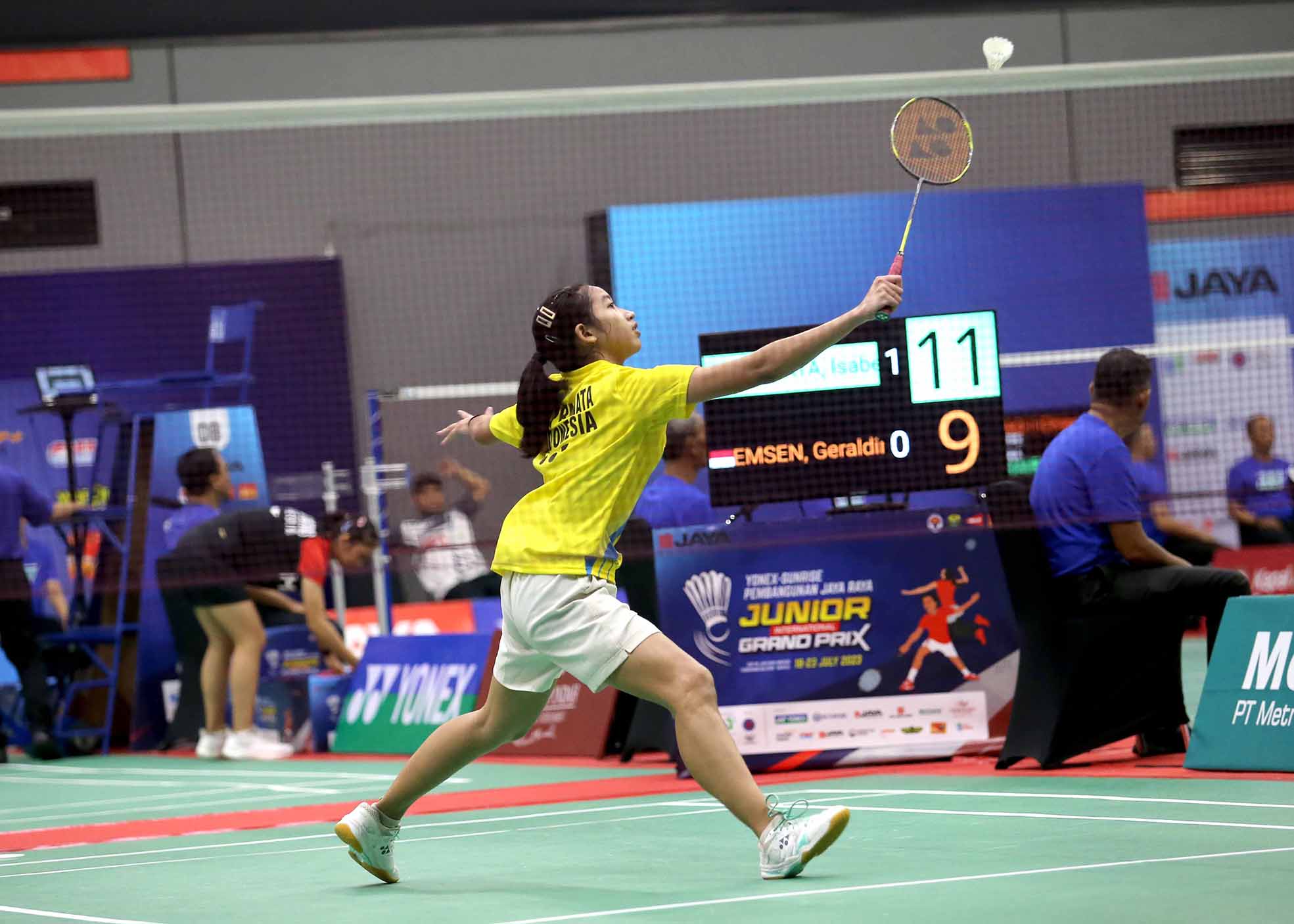 Aksi Isabele Revanna Andalova Pranata atlet Tunggal Putri Jaya Raya U15 Yonex Sunrise Pembangunan Jaya aya Junior Internasional Grand Prix 2023. Gor Jaya Raya Bintaro, Tangerang Selatan 20/7/2023