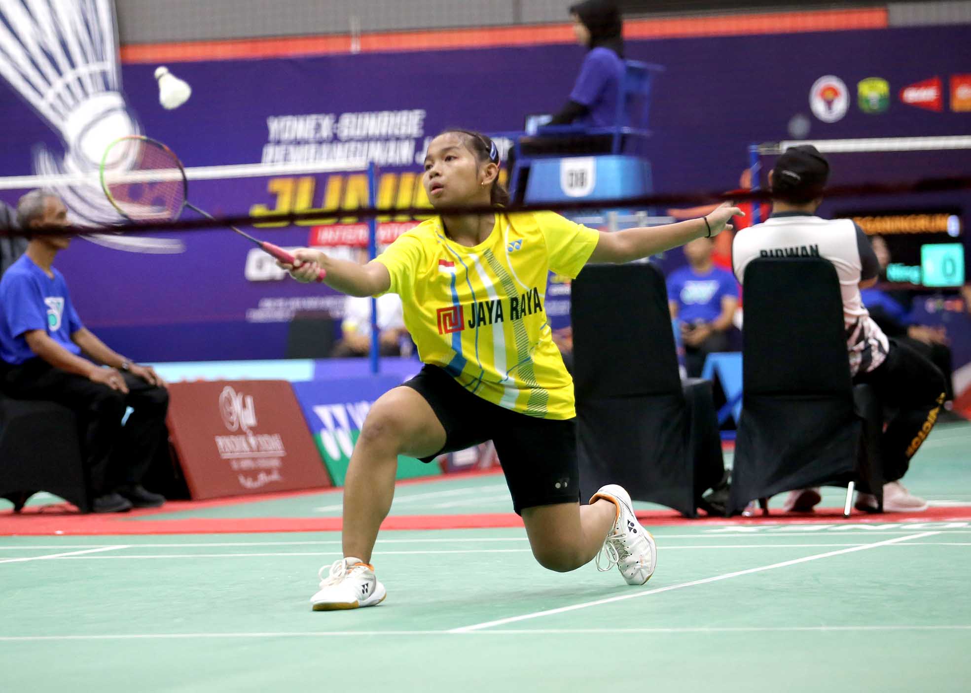 Aksi Miftaqul Putri Ayudis atlet Tunggal Putri Jaya Raya U15 Yonex Sunrise Pembangunan Jaya Raya Junior Internasional Grand Prix 2023 yang berlangsung di GOR Jaya Raya Bintaro, Tangerang Selatan 20/7/2023