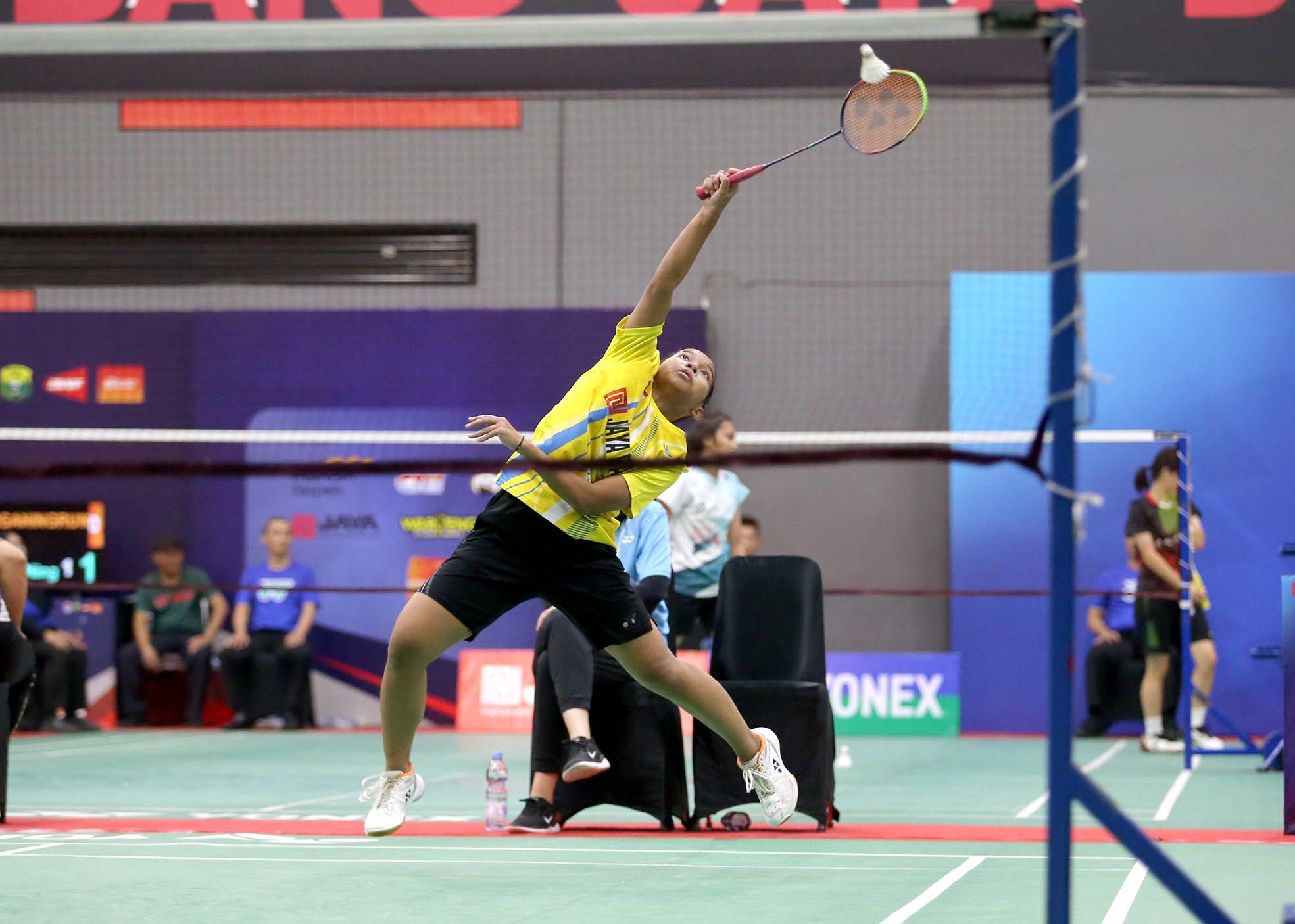 Aksi Miftaqul Putri Ayudis atlet Tunggal Putri Jaya Raya U15 Yonex Sunrise Pembangunan Jaya Raya Junior Internasional Grand Prix 2023 yang berlangsung di GOR Jaya Raya Bintaro, Tangerang Selatan 20/7/2023