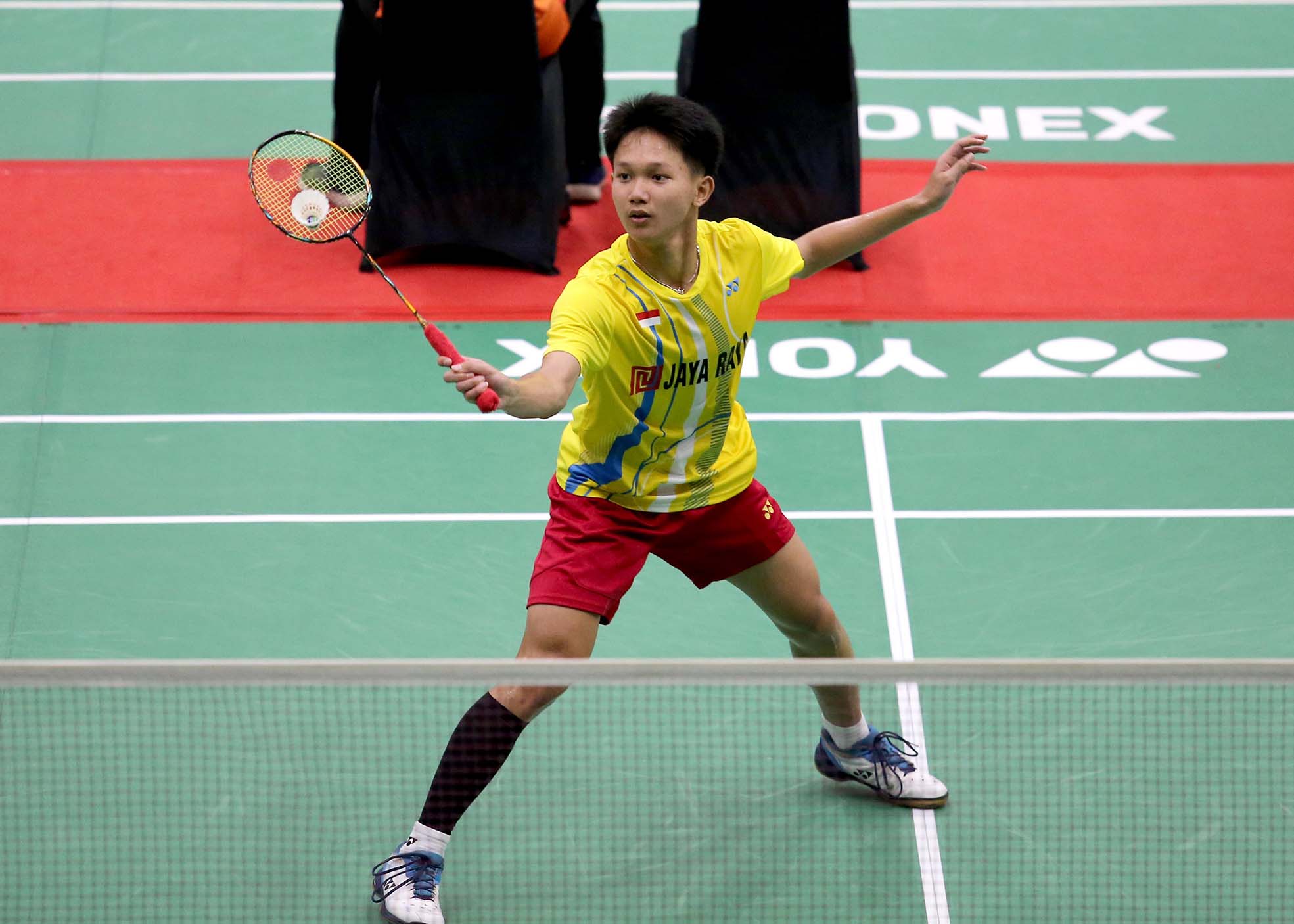 Aksi Yusack Christian atlet Tunggal Putra Jaya Raya U15 Yonex Sunrise Pembangunan Jaya Raya Junior Internasional Grand Prix 2023 yang berlangsung di GOR Jaya Raya Bintaro, Tangerang Selatan 20/7/2023