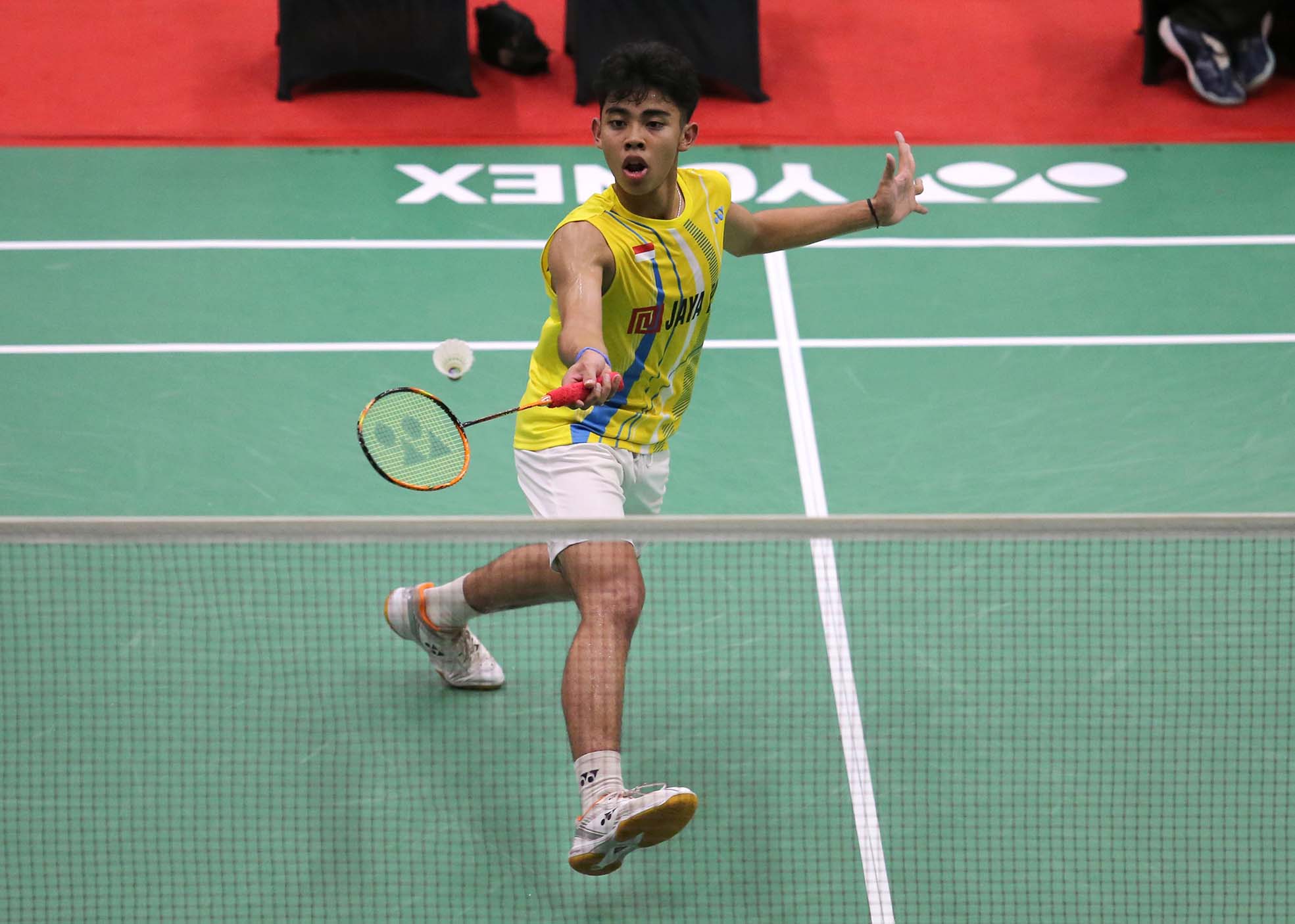 Aksi Kanya Denis Azzarya atlet Tunggal PutraJaya Raya U15 Yonex Sunrise Pembangunan Jaya Raya Junior Internasional Grand Prix 2023. Gor Jaya Raya Bintaro, Tangerang Selatan 20/7/2023